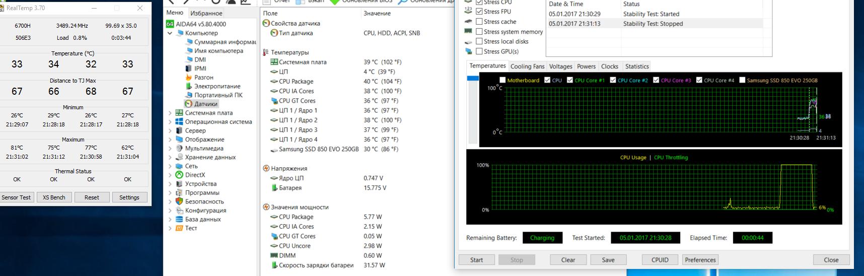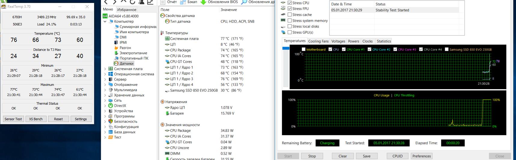 Всем доброго времени суток. Помогите разобраться. Ноутбук Lenovo Y700-15ISK Тип ЦП QuadCore Intel Core i7-6700HQ, 3500 MHz (35 x 100) За 1 минуту он разгоняет температуру до 78, но на разных ядрах разная температура (в разницу 10-20 градусов), после отключения стресс теста сразу падает до 30. Еще смущает что ЦП показывает 4-7 градусов, что раньше было 25-40. Можно в ЛС. Спасибо.
