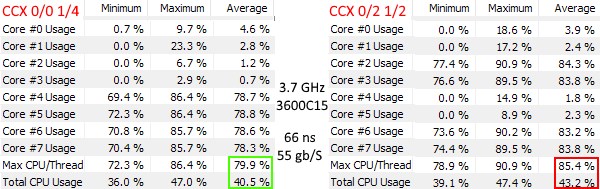 Следующие тесты выполнили 8 (основных) потоков DAWBench (RCX-EXT, 7 треков x 8 плагинов FX) в Reaper на 4 ядрах. Левая сторона - 4 ядра CCX1, правая сторона - 2 ядра CCX0 + 2 ядра CCX1. SMT отключен.