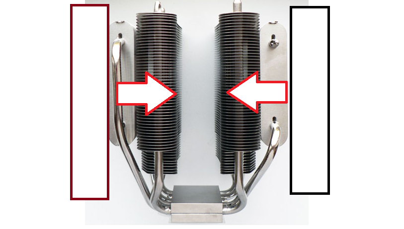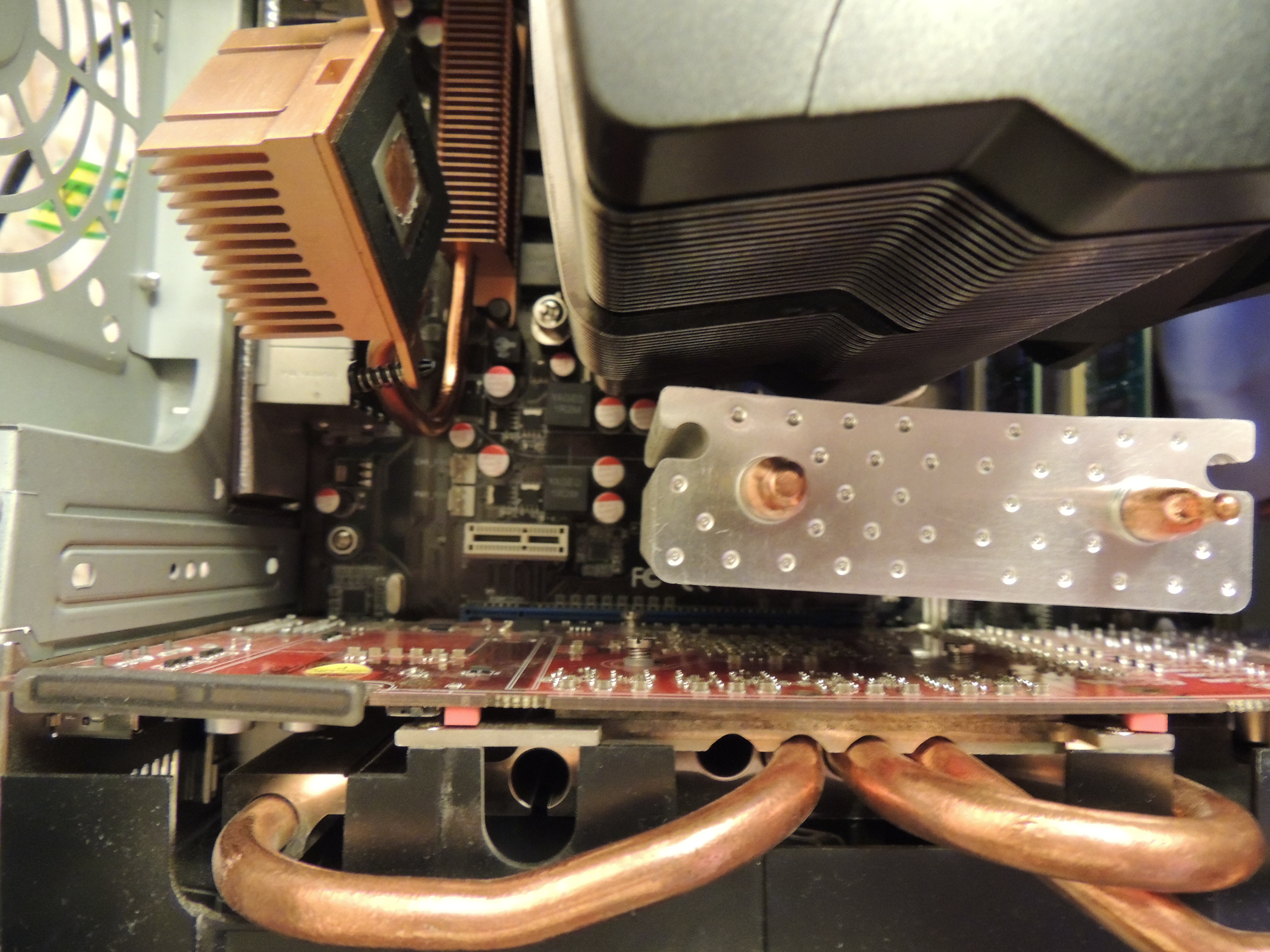 у coolermaster v8 по иному нужно располагать вентили и их должно быть как минимум два я вынимал единственную 120мм, снимал верхний кожух, которые держал вентиль, внимание! цеплял на маленькие боковые секции при помощи резинок по вентилятору , устанавливая их на вдув в центр. как на скрине. если прижим отличный и паста не плохая, то справиться этот v8 c 4000. так по экспериментируй с отгибанием двух крайних секций в горизонтальное положение и на них можно цепануть по вентилю на 120мм. это не беря в расчёт ещё 2-3 120ки на основные две секции по турбинному питу. этот способ дал тишину, но не максимальную отдачу от радиатора ps. у меня 1 способ скинул скинул 15 градусов с заводского разположения одного вентиля с разогнанного фенома x4 под линпаком. вентили были две AC f12 по 1200об/мин