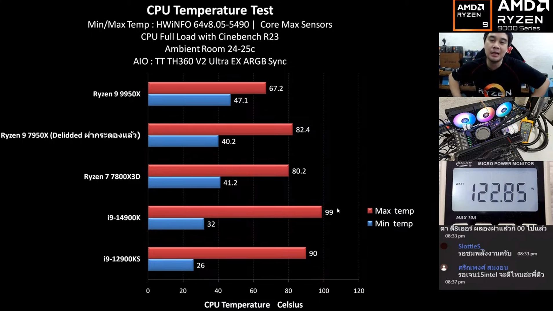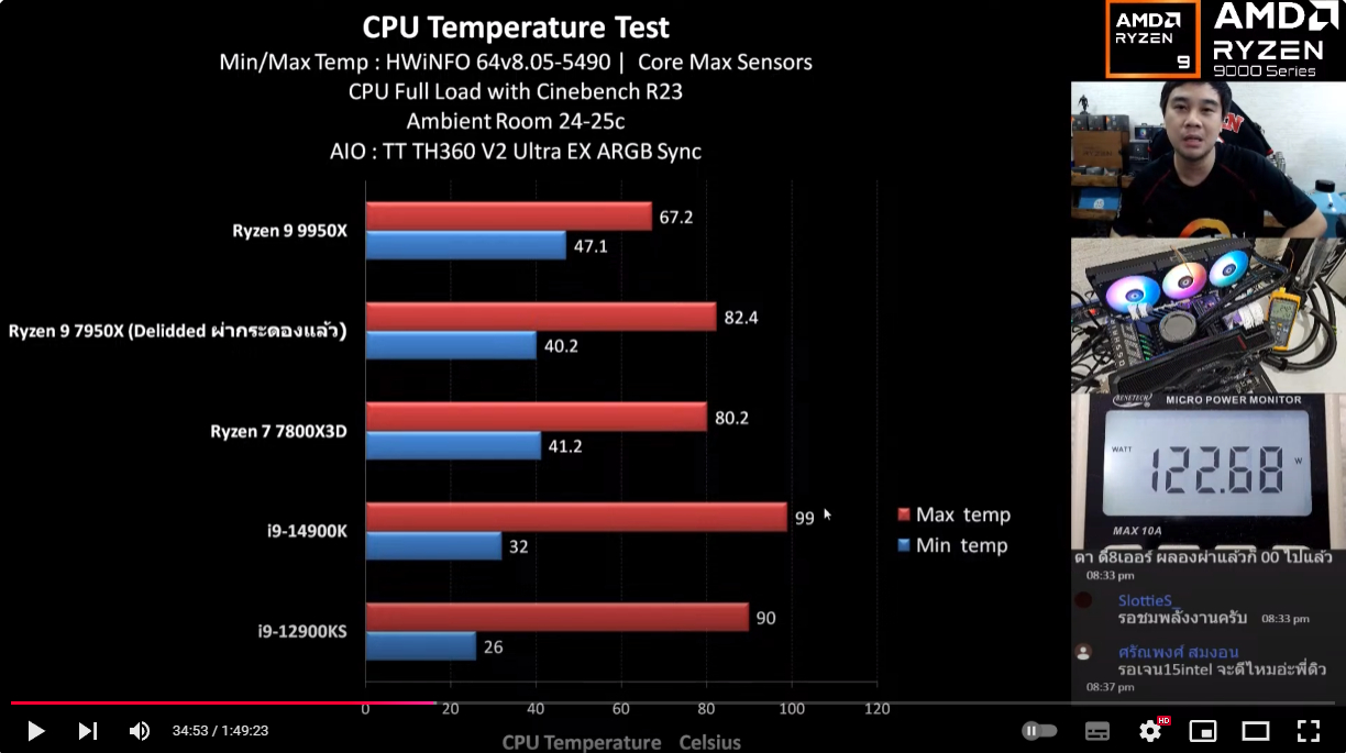 В 23 синебенче при потреблении 230Вт темпа прям фантастИк, минус 15 град от 7950х без крышки(или там ж.металл, не ясно). Вот вам и перенос датчика, хехе. Чтоб валидола поменьше было. 14900к, конечно, грелка та еще...