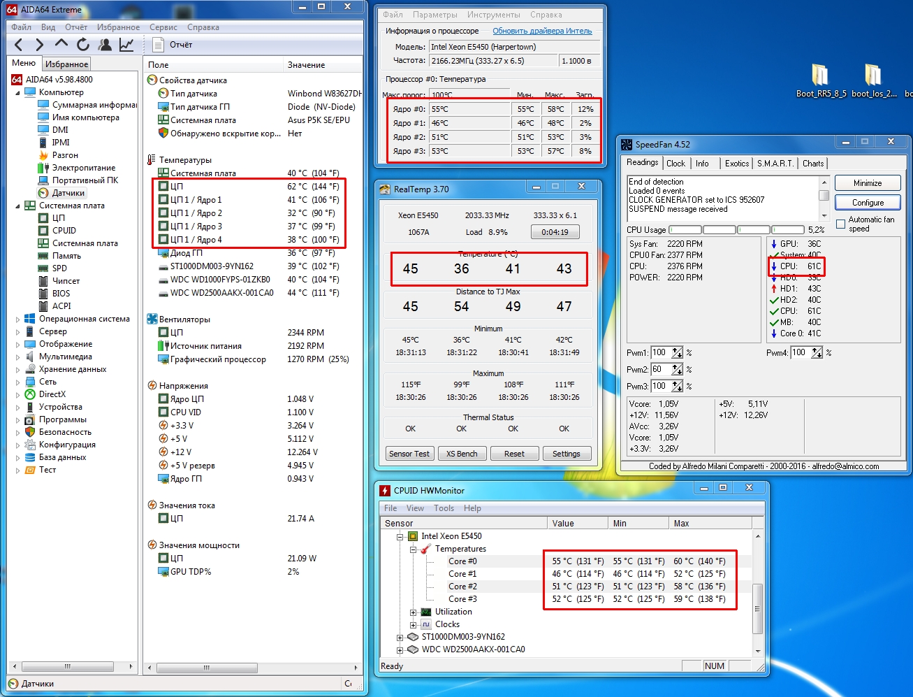Привет. Какой проге верить по температуре? xeon e5450 на плате Asus p5k se/epu. Кулер боксовый интел, паста свежая GD910 проц не разогнан. BIOS mod прошит. В простое от 50 до 60 градусов. в работе максимум 75. Вроде многовато? Aida, speedfan, coretemp показывают примерно одинаково, а вот realtemp на 20 градусов ниже
