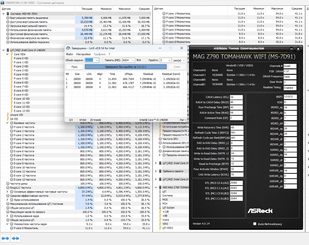 mTwick 5400 процессор берёт, но на этой частоте в Cinebench23 88C при авто напруге 1.38В. В линксе под сотку улечу, а минимальную напругу не искал для 5400МГц.