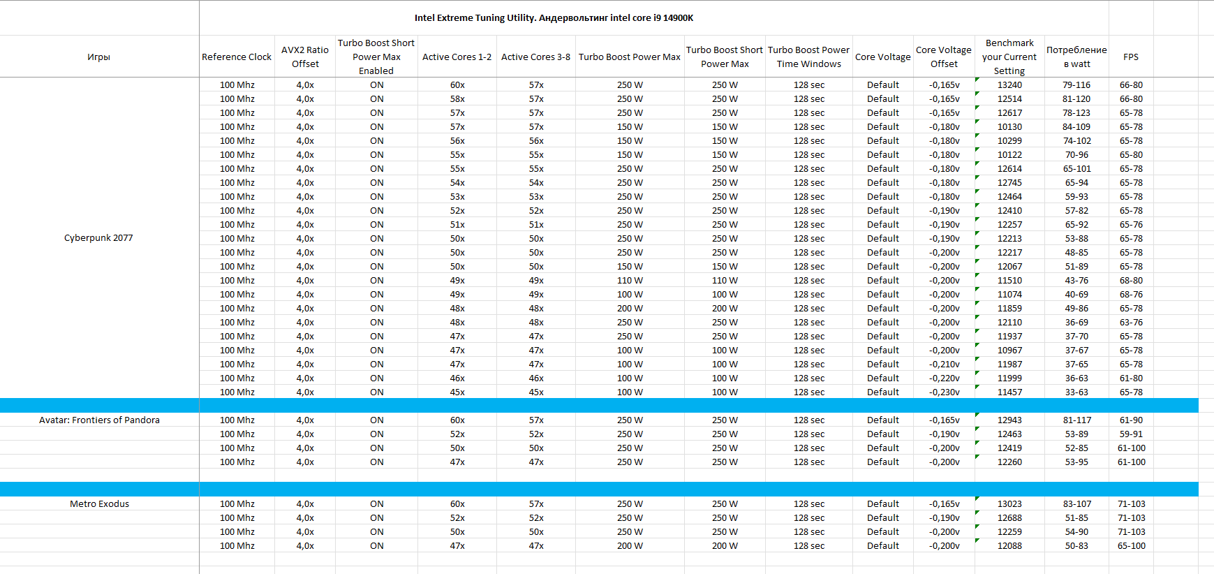 Прошу меня сильно не пинать. Никогда не занимался андервольтингом процессора, тем более i9 14900K и это мои первые шаги. Имею конфиг: CPU i9 14900K, мать MAG Z790 TOMAHAWK WIFI, Gigabyte NVIDIA GeForce RTX 4070 GAMING OC 12GB (GV-N4070GAMING OC-12GD), ОЗУ Team Group DDR5 32GB (2x16GB) 6000MHz pc-48000 T-Create Expert CL38 1.25V Black (CTCED532G6000HC38ADC01) + Windows 11 Pro. Спасибо автору Пенсионеру за этот пост, но, увы, мне это не помогло, + эта статья меня подтолкнули провести свое исследование. Ниже будут представлены мои варианты андервольтинга. Какие еще рекомендации по снижению потребления можно применить? Какие варианты андервольтинга вы используете? Буду благодарен за ваши успешные и удачные варианты андервольтинга.