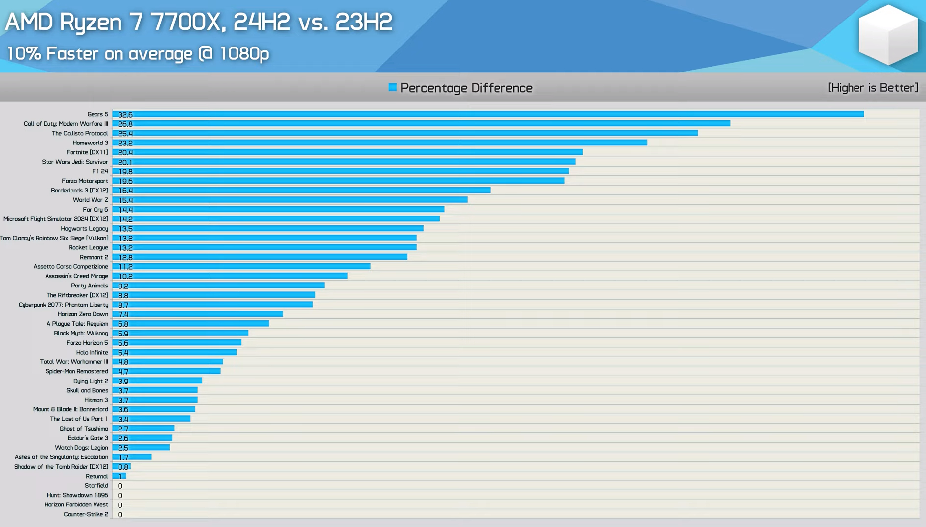 Похоже на то, что они таки решили исключить работу "целостности памяти" во время запуска игровых приложений. Разницы в играх между 23H2 с выключенной целостностью и между стоковой 24H2 - в пределах погрешности на 7800x3d. Тут другой вопрос, почему на интеле 12/13 серии в играх эта система съедает в среднем около 5%, а вот на 7800x3d падение производительности может достигать и 25%.