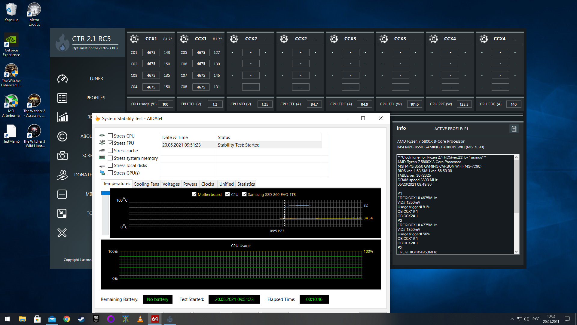 поставил CTR2.1 прогнал диагностику, выдало GOLD, принял предложенные частоты и напругу P1 4675 на 1,25 Р2 4775 на 1,35 температура в аида и синебенче упала на 10 гр (до 80 и 74 соответственно) попугаев в синебенч 23 +300 а вот в AIDA FPU забавно если запустить только аиду и не дышать, то все норм и 10 минут и 20, но если попытаться что то еще запустить, то сразу вылетает Если запустить еще HWinfo , то вылетает через 2 минуты