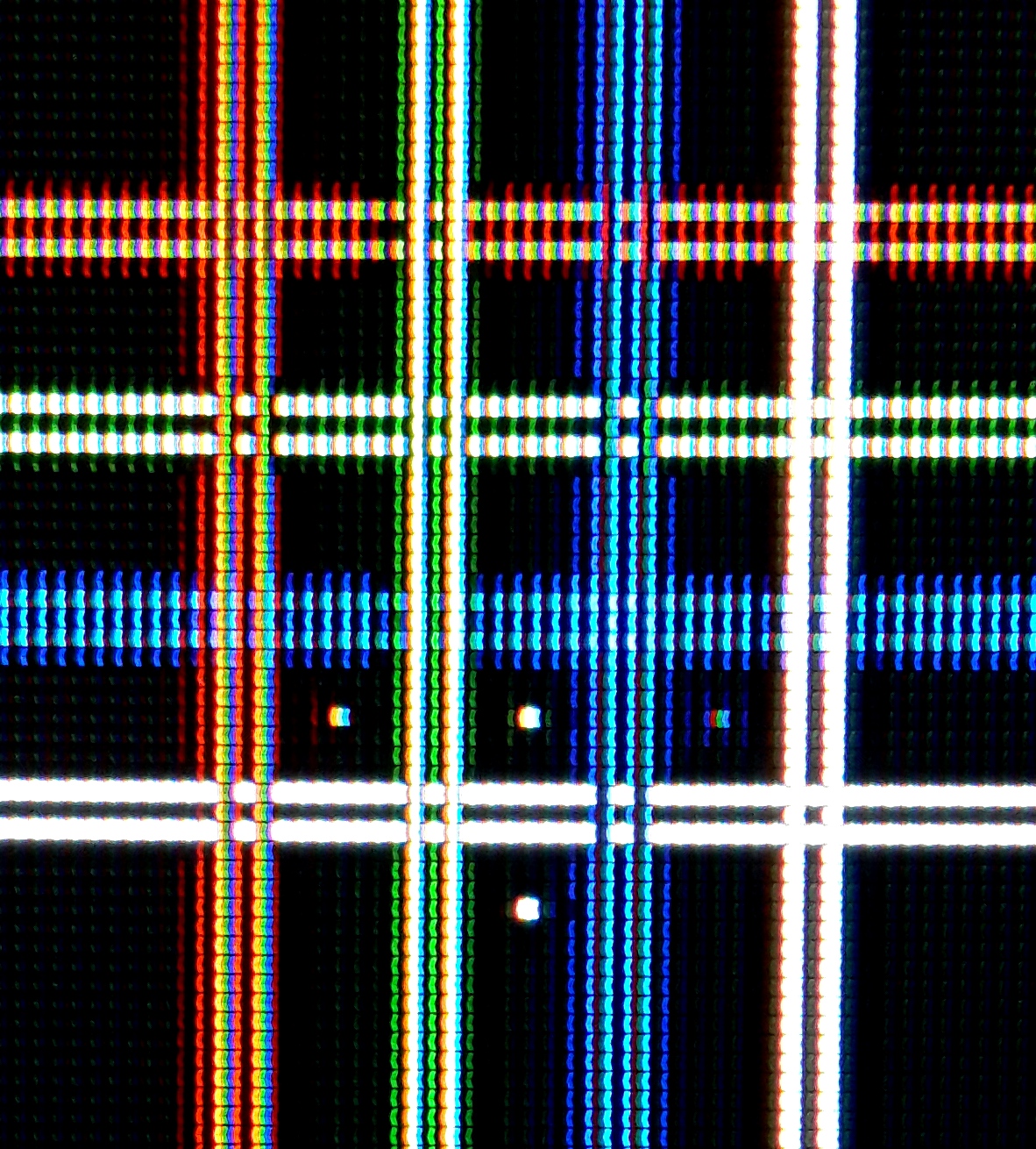 озможно так достигается просто большая яркость. Еще прикол что горизонтальные однопиксельные линии в принципе ведут себя аналогично, но подсвечивается не соседний пиксель, а вторая половина основного пикселя, так как все пиксели по вертикали разделены на не равные верхнюю и нижнюю части и яркость изменяется сначала в одной половине пикселя, а потом в другой, фактически по вертикали пикселей в два раза больше, чем разрешение у матрицы, но при этом градаций яркости у каждой половинки меньше.