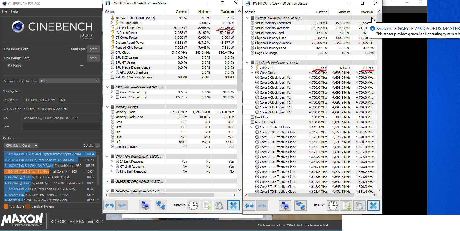 Провел тест. Конфигурация: 11900 (без К), Z490 AORUS MASTER Bios F20, 2*16 Гб DDR4 16-16-16-39 (ХМР профиль, напряжение на память 1.4 В). Все настройки биоса по умолчанию. Без офсетов АВХ и напряжения на ядра.