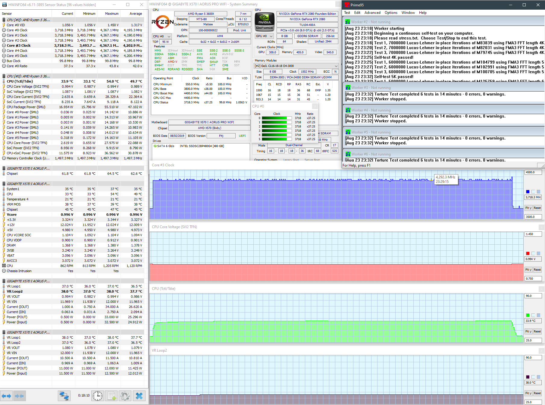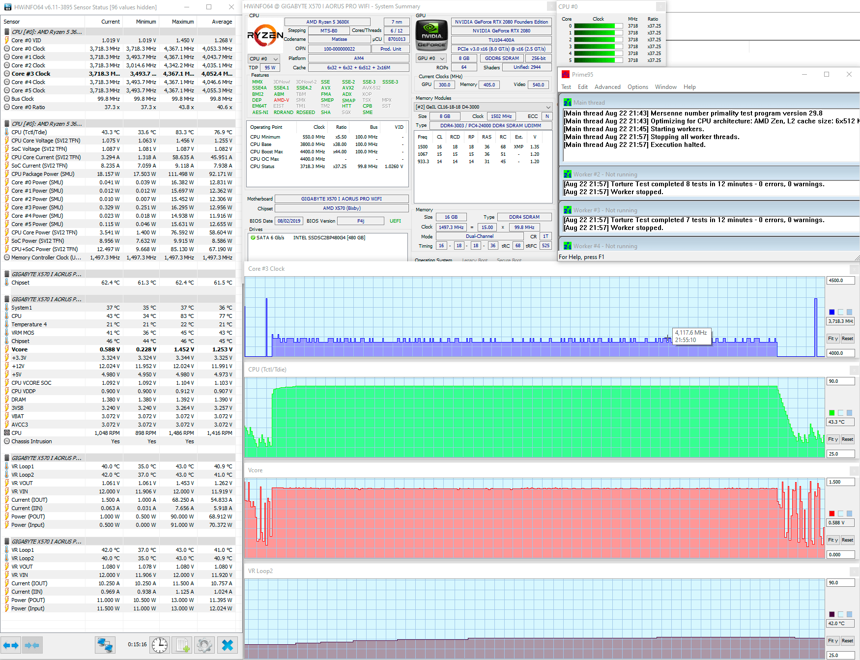 All Немного потестировал AMD Ryzen 5 3600X на маленькой платке Gigabyte Aorus X570 I Pro WiFi (F4j) с охлаждением Noctua NH-D15 (с одним вентилятором на 900-1500 об/мин) в закрытом корпусе при 26,3 градусах в комнате. Так вот, в полностью автоматическом режиме настроек BIOS, не считая активированного XMP, процессор под Prime95 29.8 build 5 тест Smallest FFTs греется до 83 градусов Цельсия, VRM до 43, чипсет постоянно на 61-62 градусах: