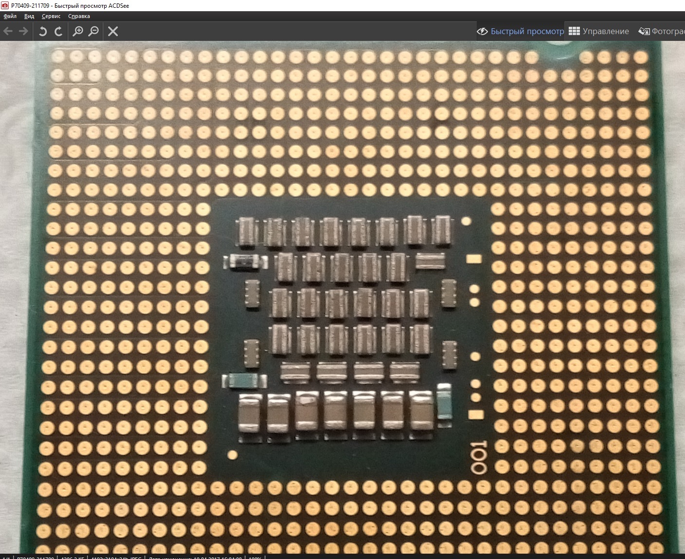 Фото процессора X6800. Собираюсь купить данный экземпляр, но немного странно выглядит "горизонтальный" конденсатор слева вверху. Будто перемычку, идущую поверх конденсатора, разрезали. Что это? Может быть признаком неисправности или экспериментов с разгоном?