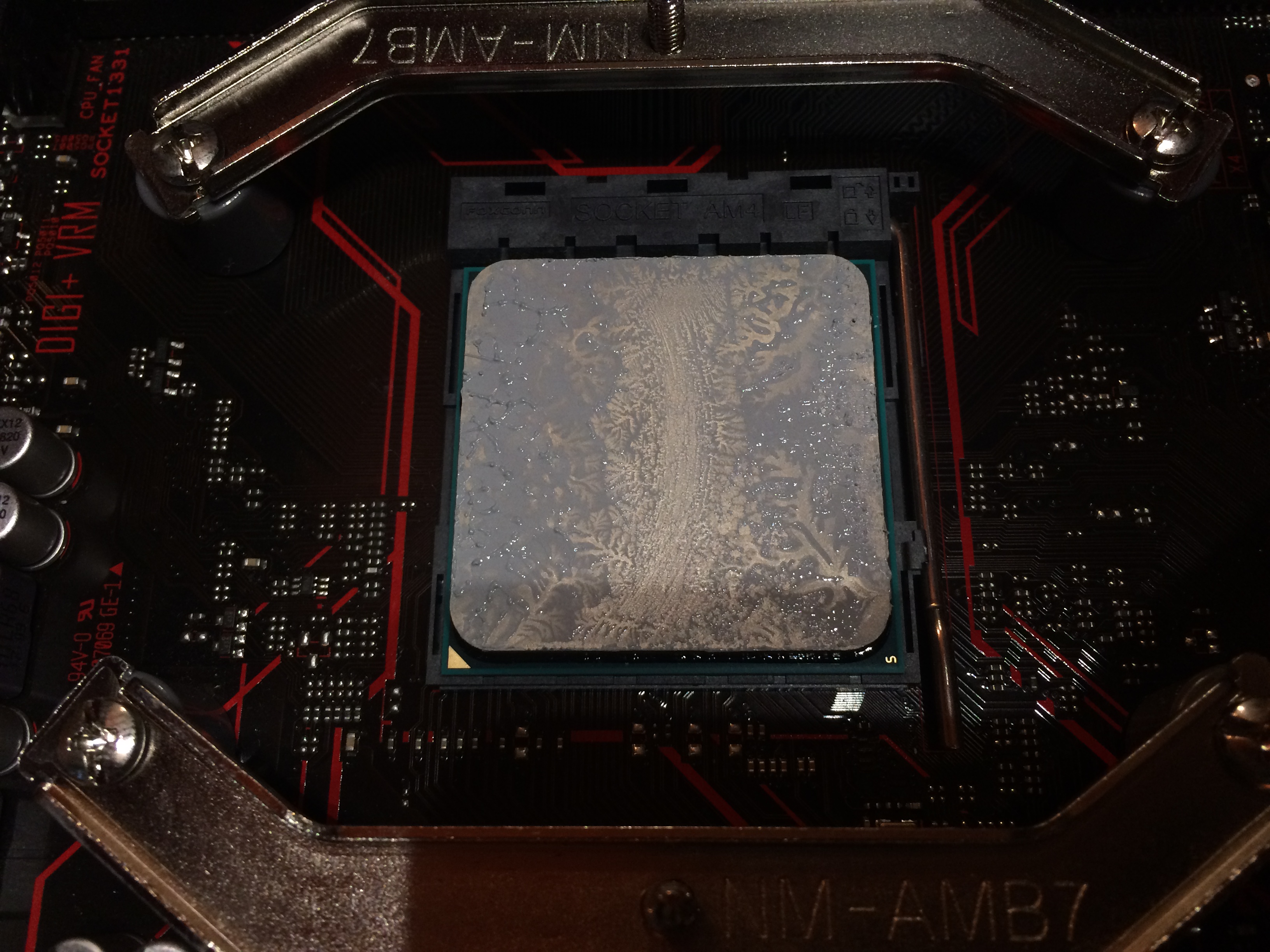 Неправильно. На подложке есть треугольный ключ. Относительно него кристаллы процессора сориентированы как показано во вложении. Сейчас вода течёт вдоль чиплетов, а не поперёк. Не самое выгодное расположение.