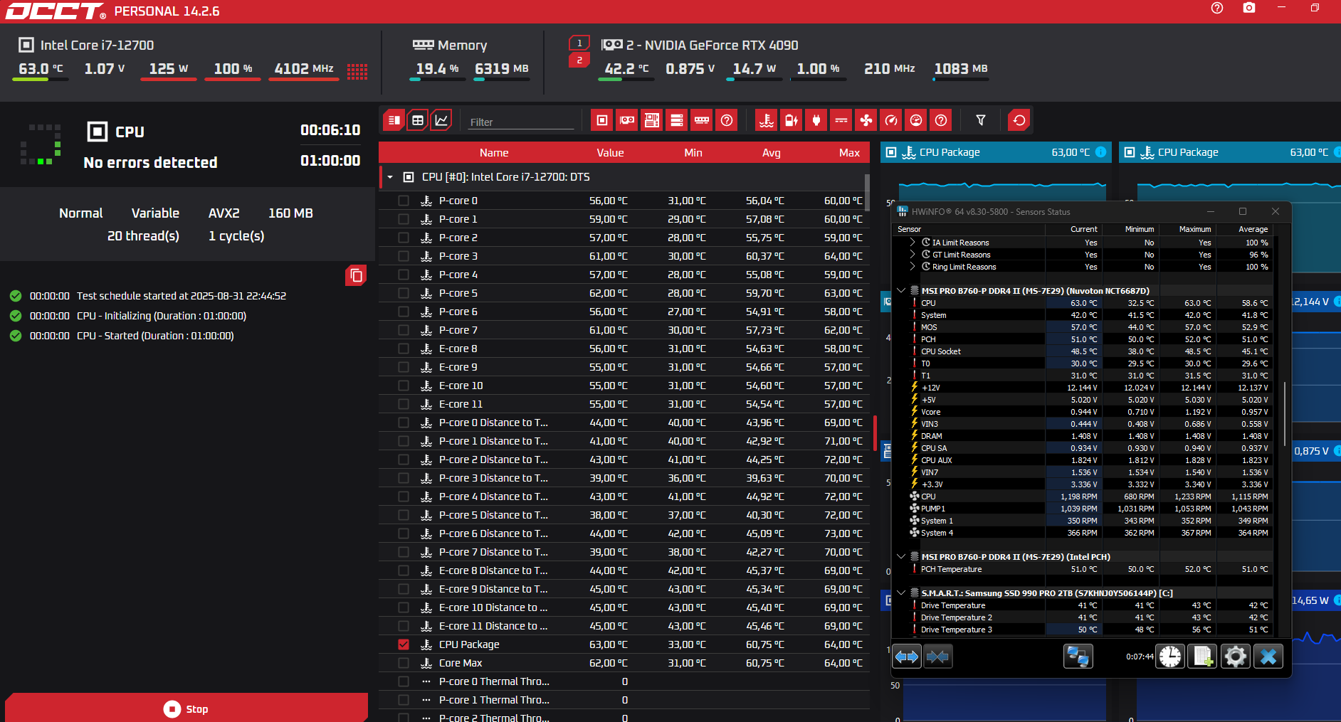 Походу деграднул мой проц 12700 после длительного power test occt на максималках, я гонял его более 5 минут и со снятыми лимитами видяхи и также задействовал встройку, то есть все доступные графические процессоры, проц прогрелся до 74, до 80 по самому горячему ядру. Теперь когда я запускаю этот тест он виснет иногда через минуту а иногда и через несколько секунд, ранее такого небыло, я мог гонять его подолгу но ранее я не снимал лимиты с видяхи когда гонял и не задействовал встройку, видяха была зажата по потреблению на 80% и ниже. Теперь с теми же лимитами видяхи и без встройки все равно висюки, придется походу андервольт ослабить, но так то в системе играх и cb23 висюков нет после 30минутного теста. Но есть одна деталь - когда я гонял повертест ранее частота всех ядер опускалась чуть ниже 3900, а теперь она почему то стала держаться чуть выше 4100, что изменилось непонимаю возможно это и не дегрод а просто частота стала выше при той же мощности по каким-то причинам, наверное недавняя автоматическое обновление винды как-то повлияло.