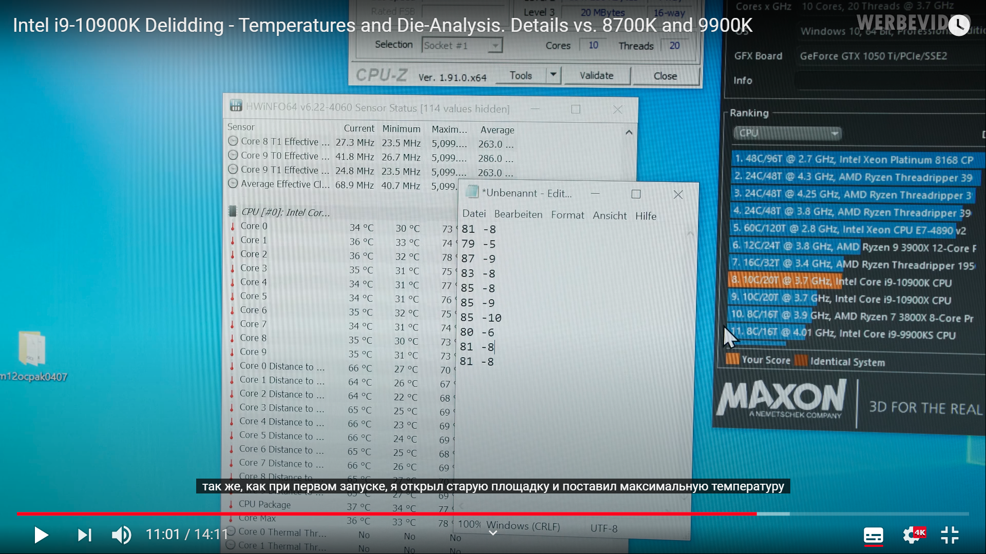В среднем скальп дал минус 8С по всем ядрам в тесте Cinebench R20. Предположу, что при монтаже ватерблока на голый кристал, можно получить минус 12-15С. Так же благодаря оптимизации с толщиной кристала и.т.д, температуры I9-10900 остались на уровне I9-9900 или немного выше.