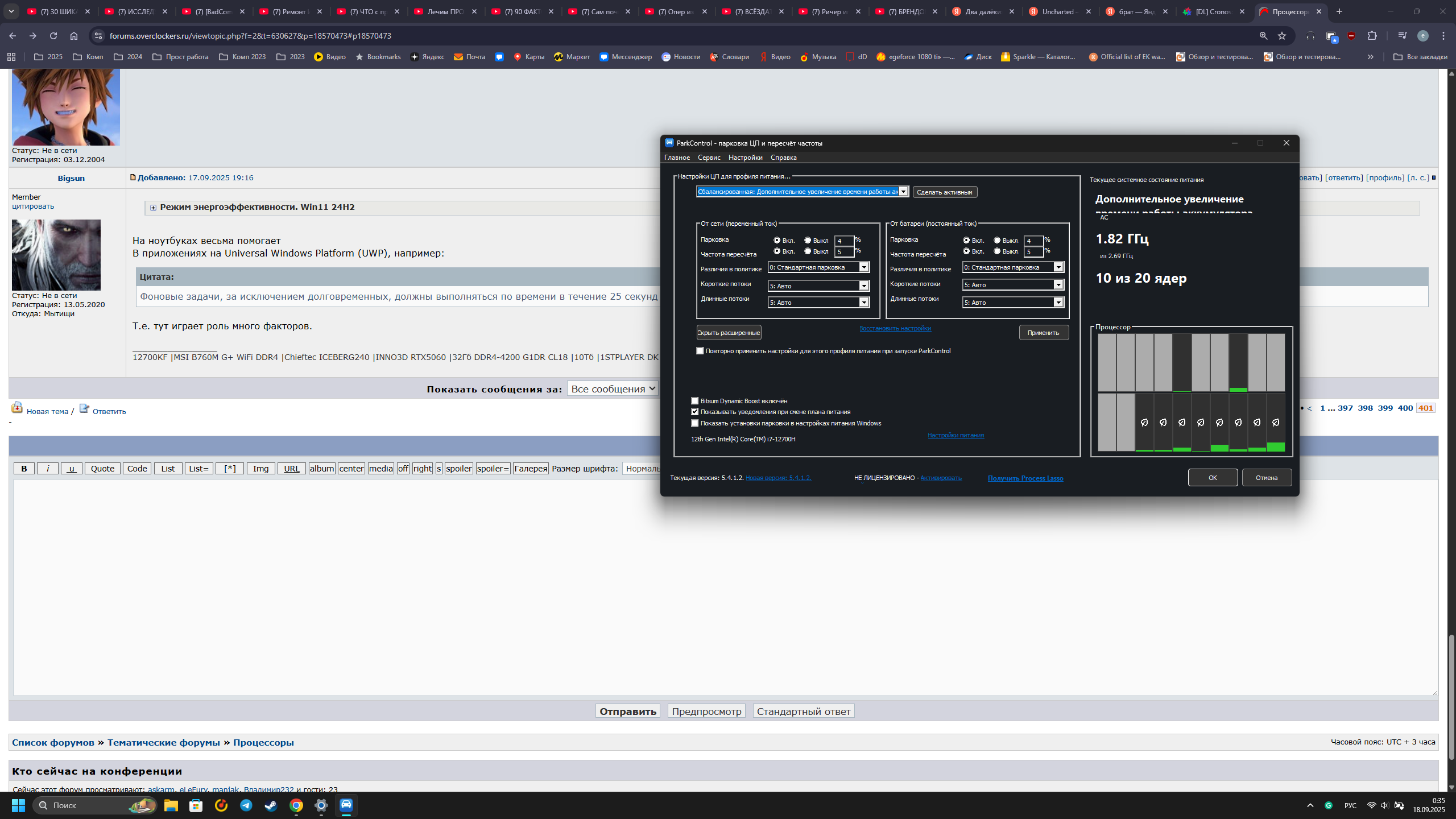 Макс_Дон я их понаоткрывал, что бы побольше нагрузки дать попробовать с надстройкой "только энергоэффективные ядра". При этом слабые ядра не просыпаются даже в том случае, когда я перевел абсолютно все процессы хрома в диспетчере (а потом и в process lasso) на энергоэффективный режим + 5 фоновых программ.