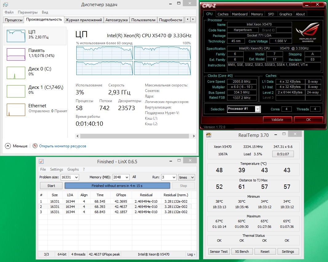 motnahp Кулер нагревается и выдает ощутимо горячий поток воздуха. С удовольствием понижу температуру, но пытаюсь разобраться какие параметры я упустил, чтобы процессор остался в приемлемом разгоне. Иначе, ессесно теряется смысл его покупки и переход с q9450 до x5470. В данный момент под такими температурами работает и работает заметно шустрее предыдущего оппонента. Фпс в требуемых играх вырос в два раза. Это устраивает, но насиловать проц нет желания. Сейчас вторые сутки работает в таком режиме в небольшой нагрузке от dlna и фоновых программ, стабильно. П.С. Попробую выставить напряжение. Трубки вечером проверю обязательно. Спасибо!