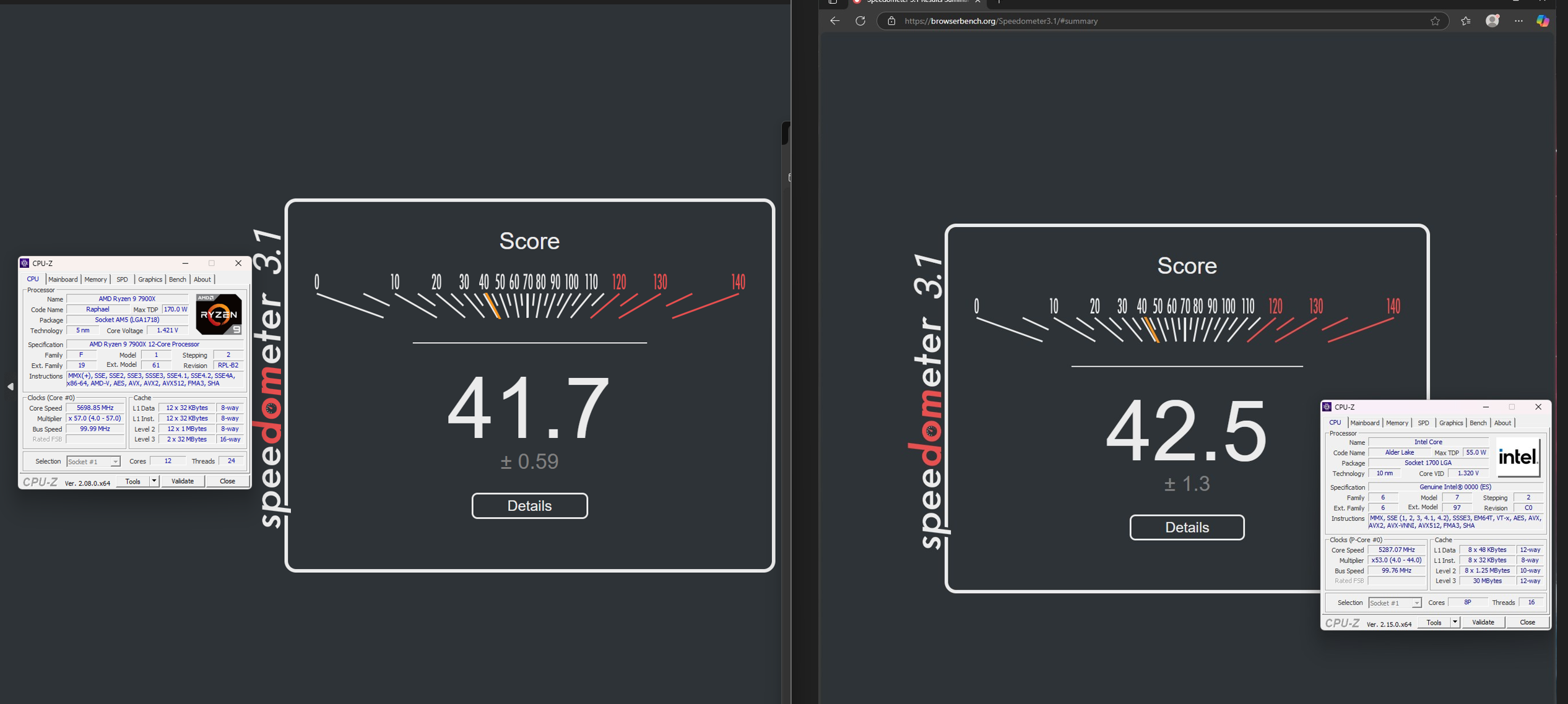 Zen4 7900X сливает в speedometer 3.1(малопоточный тест) имея частоту 5.7GHz против 5.3GHz у Alder.