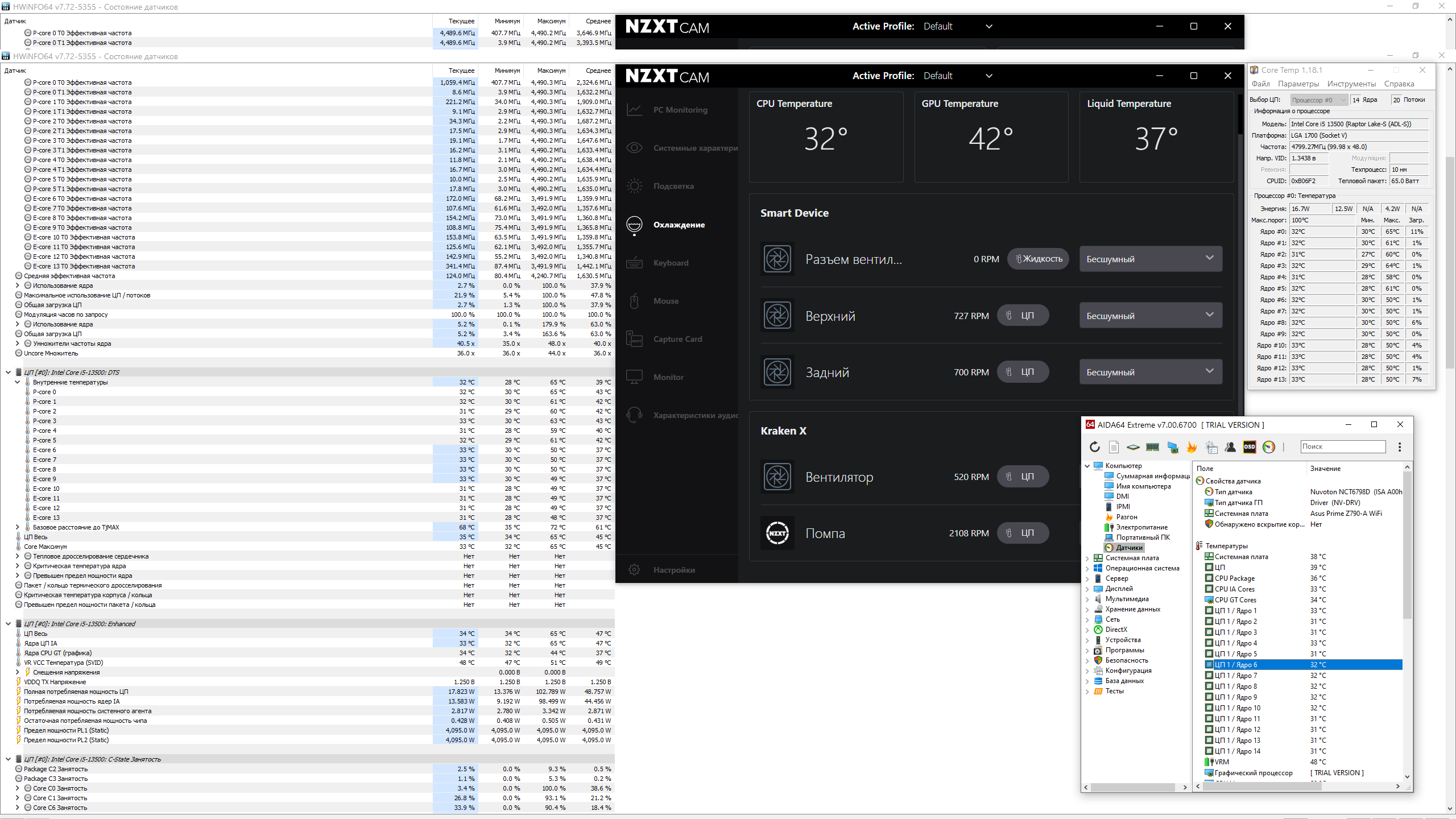 Ребята, вопрос следующий почему такой разброс температур в программах и какой температуре верить? Если посмотреть на скрин экрана, то там несколько программ, которые показывает температуру процессора и она везде разная, разница в 5 и более градусов. Так как использую программу NZXT CAM для настройки охлаждения в зависимости от температуры процессора, сомневаюсь что NZXT CAM правильно реагирует на охлаждение процессора. На предыдущей сборке на ASUS tuf h370 pro, i5-8600 все было нормально. Подскажите в каком направление копать и где искать "собаку"?