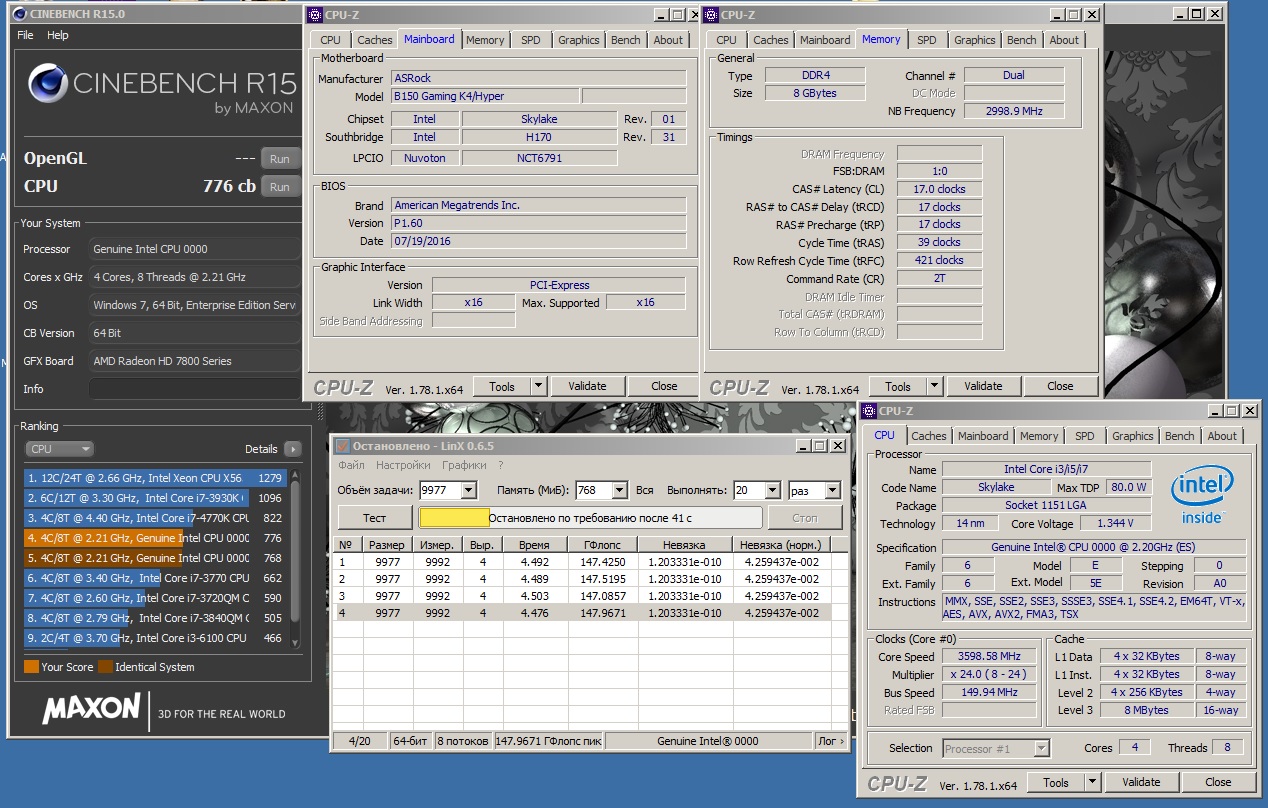 Поделюсь своим опытом разгона QH8G на материнке ASROCK H170-PRO4/Hyper. Получил я сегодня камень, вставляю в мать, включаю, завелось! Но радость была не долгой...В стоке все работало нормально, но стояло изменить значение BCLK хотя бы на единицу, множитель намертво фиксировался на значении 8 и система стартовала с частотой около 850Mhz...Перепробовал разные множители цп и кэша, включал-выключал Intel speed step и турбо буст, ничего не менялось, множитель держался на 8. Зашел на форум корейских биосов в надежде найти там инфу по своей матери. Оказалось что h170 имеет проблемы в разгоне инженерников: на QHQG отключались AVX и мониторинг, на QH8G, как я выяснил, множитель...в связи с этим корейских биосов под данную мамку нет. "Видимо придется менять мать" - подумал я, на последок решил попробовать программатором зашить корейский биос от Fatal1ty B150 Gaming K4/Hyper, так наши платы очень похожи...Успешно прошил, включаю....Завелось! Винда грузится, все устройства работают, кроме сетевой карты, она у b150/hyper на другом чипе...Пробую разгонять, сходу ставлю шину 150 и напряжение 1.35...Ииии, наконец-то, все получилось, частота 3600, AVX и мониторинг работают) В Aide показывает чипсет b150) Да это и не важно) В общем доволен как слон. Надеюсь мой отзыв будет полезен владельцам плат H170/hyper, если таковые тут найдутся.