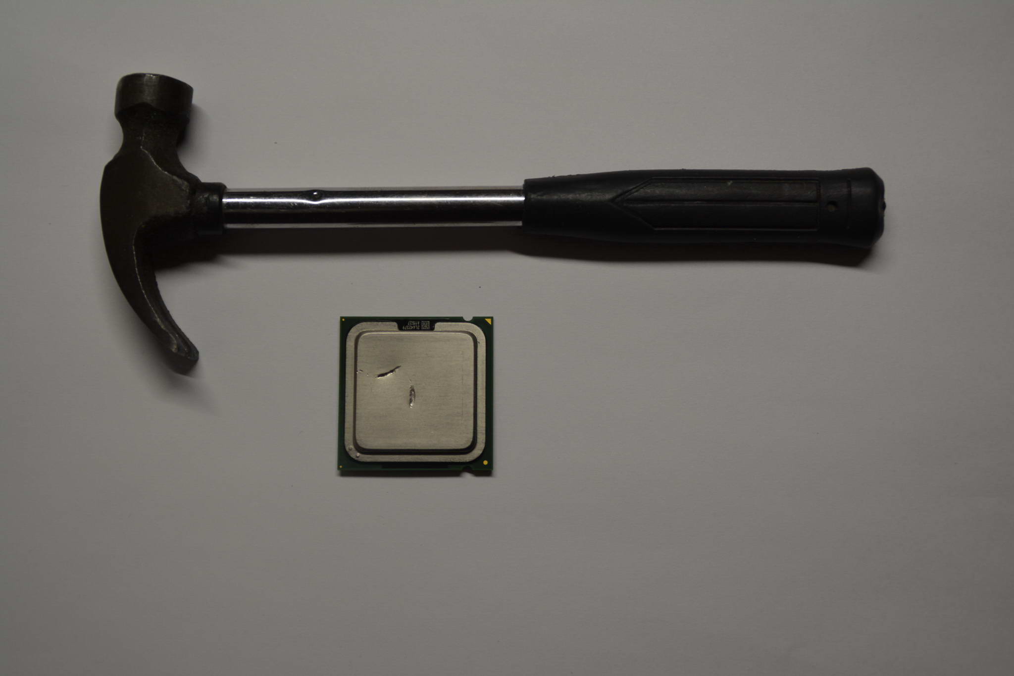 Процессор был расположен на деревянном основании и по нему нанесено два угловых удара с приложенной силой инструментом в виде молотка, весом 91 грамм.