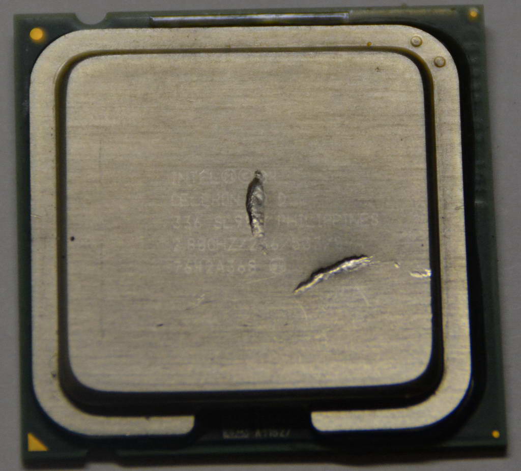 Хотя согласен, что для подобного повреждения надо очень хорошо стукнуть по ЦП, и крышку прогнёт не только в месте удара. А если капнуть кислоты на процессор, то надписи не останется. В общем - загадка))