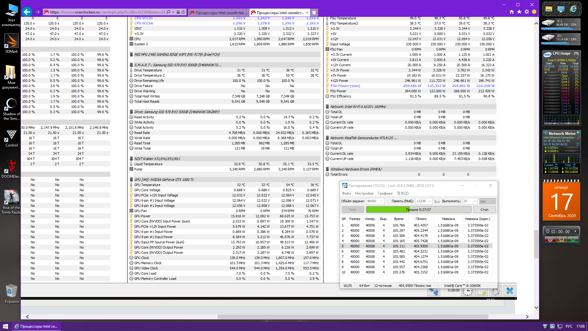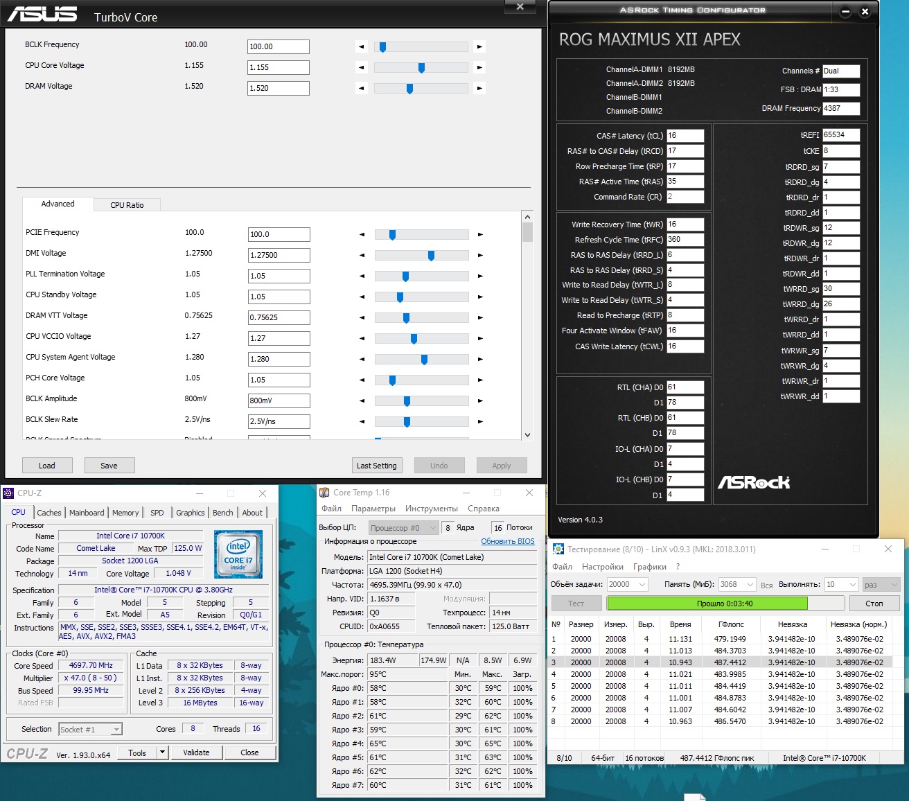 Для интереса прогнал тест LinX с задачей 20000 на частоте 4700 Mhz с минимальным напряжением. Для прохождения потребовалось 1,155 вольта с просадкой до 1,048
