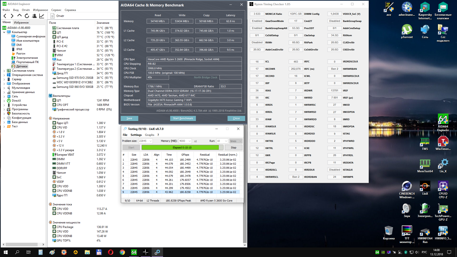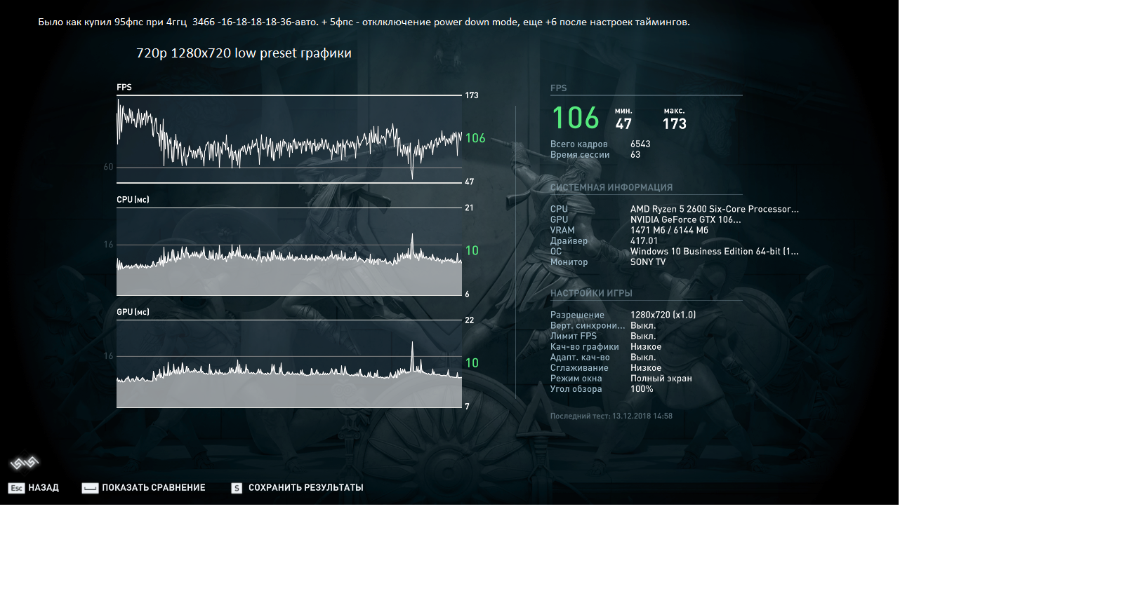 А чипы какие у тебя? Самое главное первичные тайминги + tRC, а остальное на авто нормально будет. ну RTP, потом tRRDL(S) и FAW, такими темпами все крутить придется Если фпс в играх интересует, можно с 3200-3400 выжать максимум и будет достаточно. Прирост фпс 7-10 между 3200-3600 при условии что тайминги одинаковые(https://www.youtube.com/watch?v=JSNvTewAAA8). Если тайминги ослабляешь, то выиграешь 1-3фпс и то не факт. Поставь 3466 тайминги 16-17-16-16-36(16-17-17-17-36) и tRC 56-54(не меньше чем tRP+tRAS). напряжение 1.39в vtt 0.693-0.697v это важно(промониторь при каких напряжениях на память плата выставляет vttdram(diimm) 1\2 от напряжения памяти +- 0.002в. soc 1.05-1.075в(не надо сильно на нем экономить, потом в аиде потестишь, снизишь, если нужно будет, а то он у тебя около 1в(Процессоры AMD Ryzen 1000-й серии (Summit Ridge\Zen\14nm\AM4) #15012404). Вот и холодные рестарты. потом rfc, но оно само высчитывается как то, там нсек(может от памяти зависит или от контрол памяти). Не зря же в калькуляторе для каждой частоты, зная задерку в наносек высчитывается. Ну поставь 463, сохрани - выйди - включится - пойдет значит Не включится - 485 поставь. Остальные rfc2(4) пусть авто. Пока так попробуй, знать надо, что за чипы у тебя samsung b-die или другие. И мониторинг в аиде - напряжения, скрин бы посмореть.