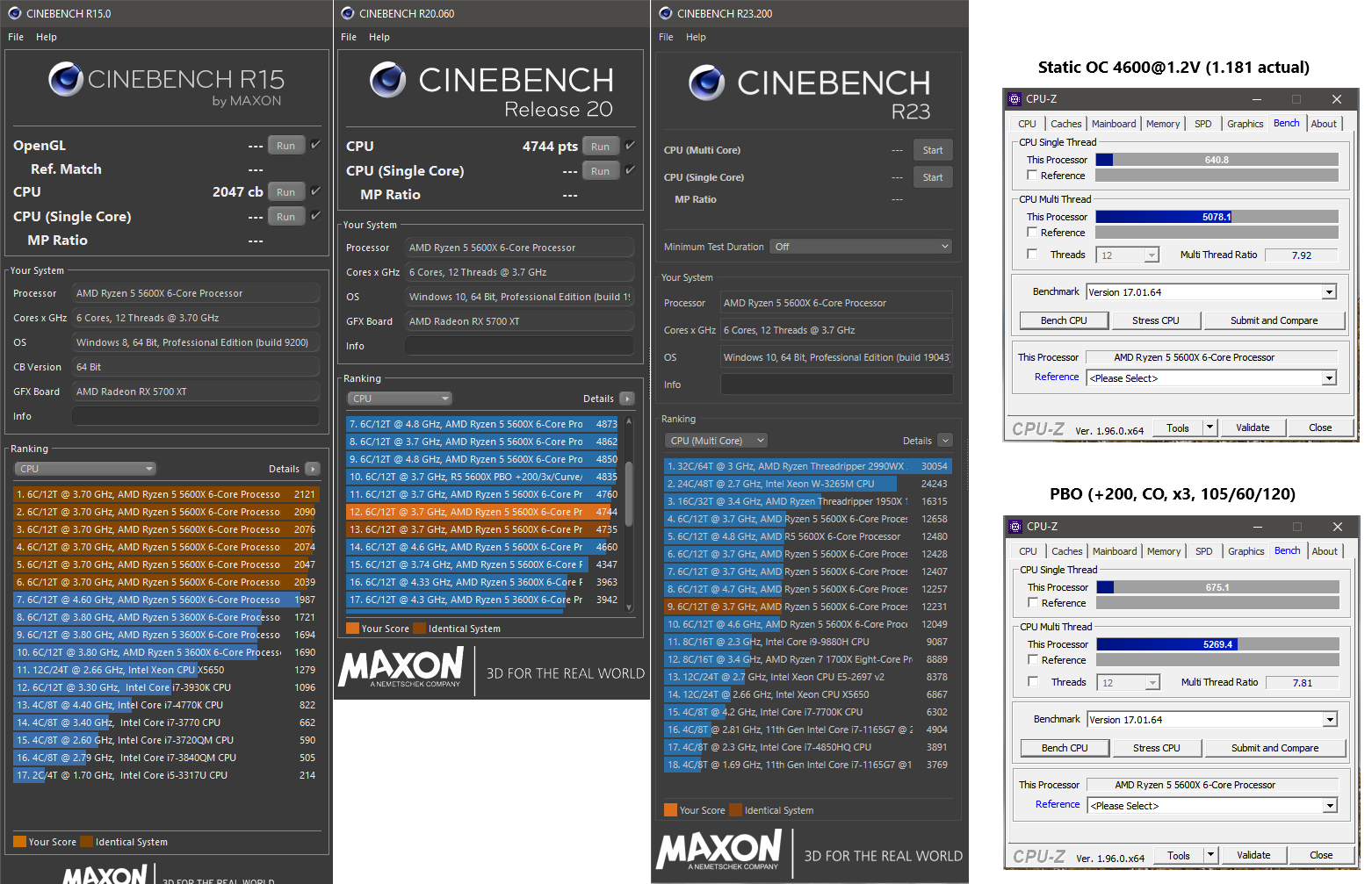 Не особо смотри на Tctl - с PBO, кратковременные скачки могут сильно влиять на его показания, так что будет показывать сильно много реальной темп, да и вообще, далась тебе эта температура. Вот с результатами сложнее. Смотри, где в настройках мог накосячить. Я прогнал свой проц в "синебенчах" и CPU-Z, 4600@1.2V vs PBO, макс. приближено к твоим условиям, и вот чо получилось c Tctl в CBR23 : 4600@1.2 - ~ 67-68°, PBO - 74-75° pез-ты на скрине, так что я бы посмотрел повнимательнее на настройки PBO да и всего остального тоже: