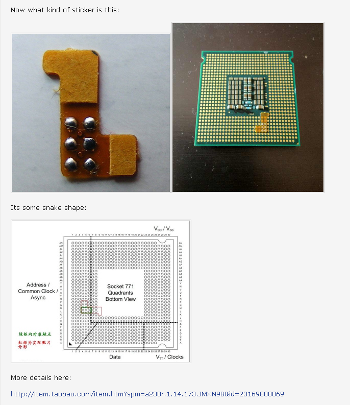 https://www.youtube.com/watch?v=kPBbpSgUXkw И сделать самому или купить переходник, который перекидывает два пина на процессоре: https://www.youtube.com/watch?v=NX48ERjMWws Результат выглядит вот так: https://www.youtube.com/watch?v=T9mA7J_YSZs Весьма и весьма впечатляет. Итого за 60$ можно заиметь неплохой Х5460 на вашей плате с ЛГА775 )) Лично у меня стоит L5430. У меня он встал без всяких прописываний кодов в биосе и прочих проблем. Я прогнал инстеловский тест для процессоров просто убедиться что все что есть работеает ОК. У меня есть куча таких адаптеров, которые я продаю на ибее (у меня там такой же ник как и на форуме) а так же могу продать за вебмани в России. Письмо с адаптером посылаю из Израиля. До Москвы доходит за неделю (вроде как), ну а если вы живете где-то подальше, то дольше конечно.