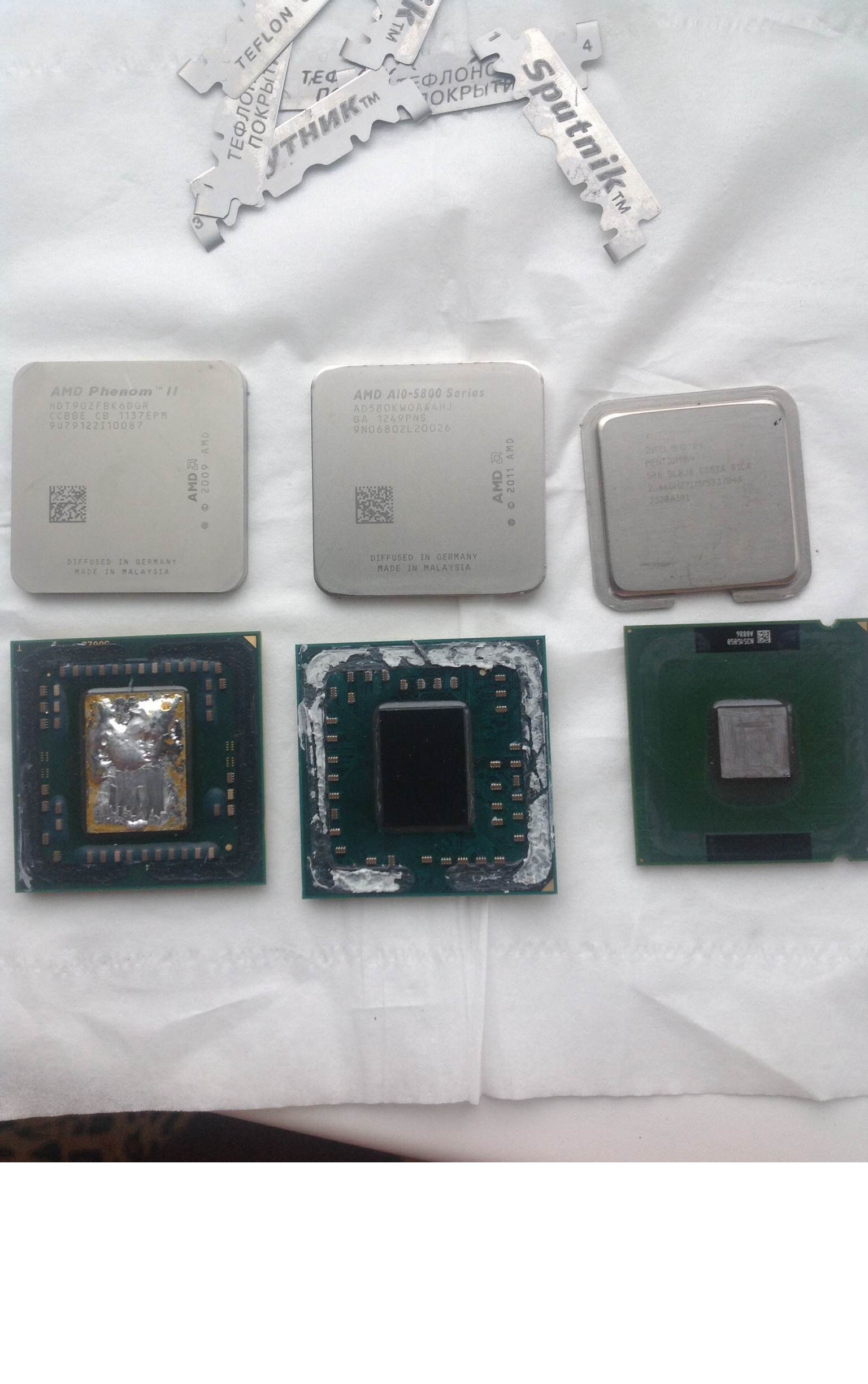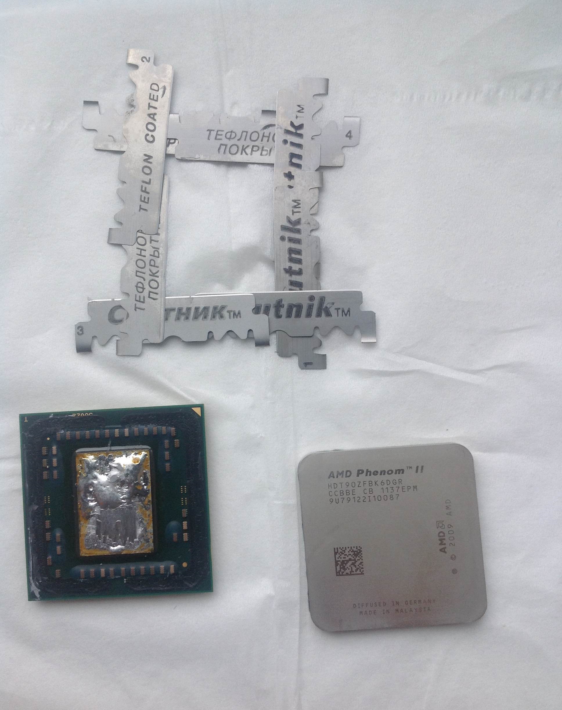 AMD Phenom II x6 Thuban. Метод - бритвенно-феновый. Состояние - полностью рабочий. Повреждённые элементы отсутствуют. Водоблок поставлен прямо на кристалл через МХ-4. Эффект - выявлено, что тот датчик, который система определяет как "температура ЦП" не находится в самом кристалле, а находится где-то в сокетном пространстве. Так же прикреплю изображение ранее скальпированных (Тубан-Тринити-Прескотт) P.S. Продам немного православного интеловского\АМД припоя