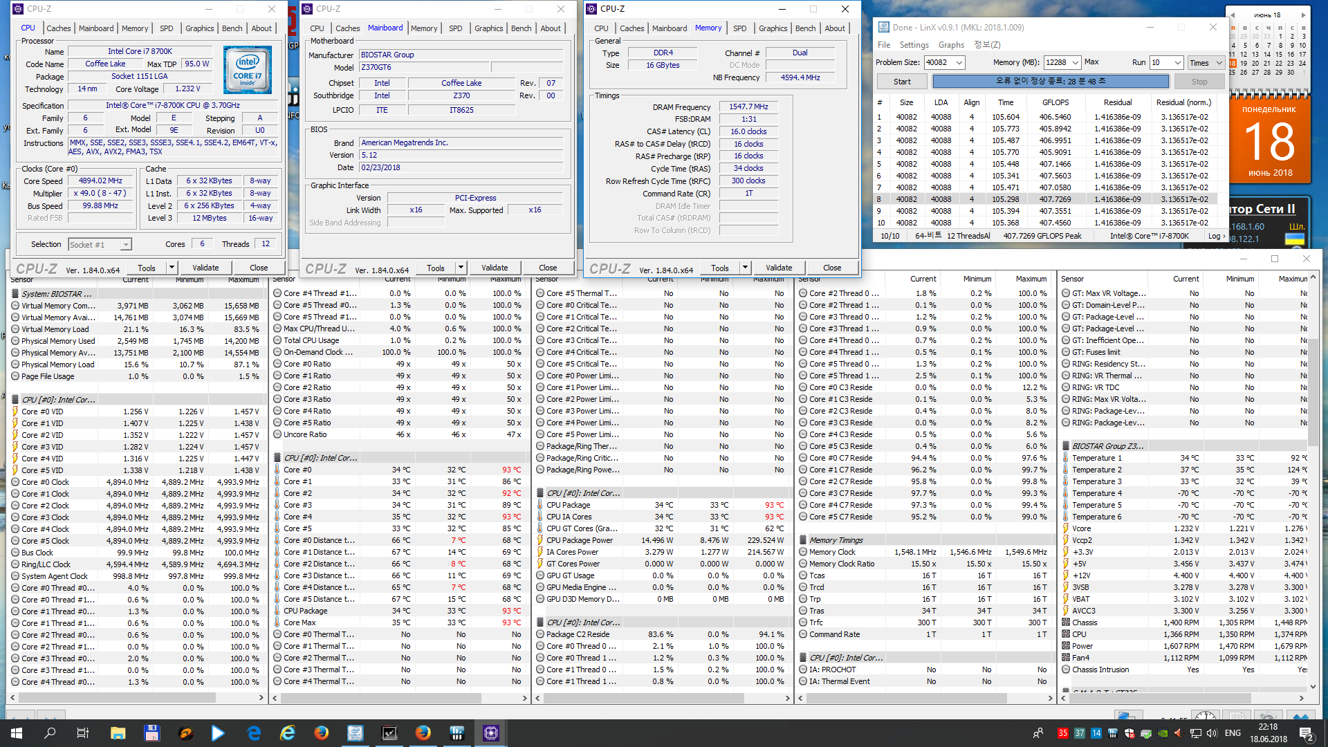 Полученный результат должен иметь следующий вид: Скриншот рабочего стола после прохождения >9 циклов (т.е. между 9 и 10 проходами). Вместе с LinX на рабочем столе должны быть развернуты CPU-Z (первая вкладка) и Core Temp, это обязательный минимум. Такой набор программ даст информацию о напряжении и температурах под нагрузкой-простоем. По желанию можете добавить другие программы, показывающие дополнительную информацию о вашей системе, например третью вкладку CPU-Z, которая покажет модель материнской платы и версию BIOS. Пример результата разгона: Mad Max, 5100 МГц (AVX 0), i7-8086K, HT-ON, Cache 4700, Vcore=1.36V, Batch L805E123, Gigabyte Z370 Aorus Gaming 7 (bios F6), Be Quiet! Dark Rock Pro 4, ЖМ под HS, Windows 10 Pro 64-bit 1809, LinX 0.9.3 64bit.