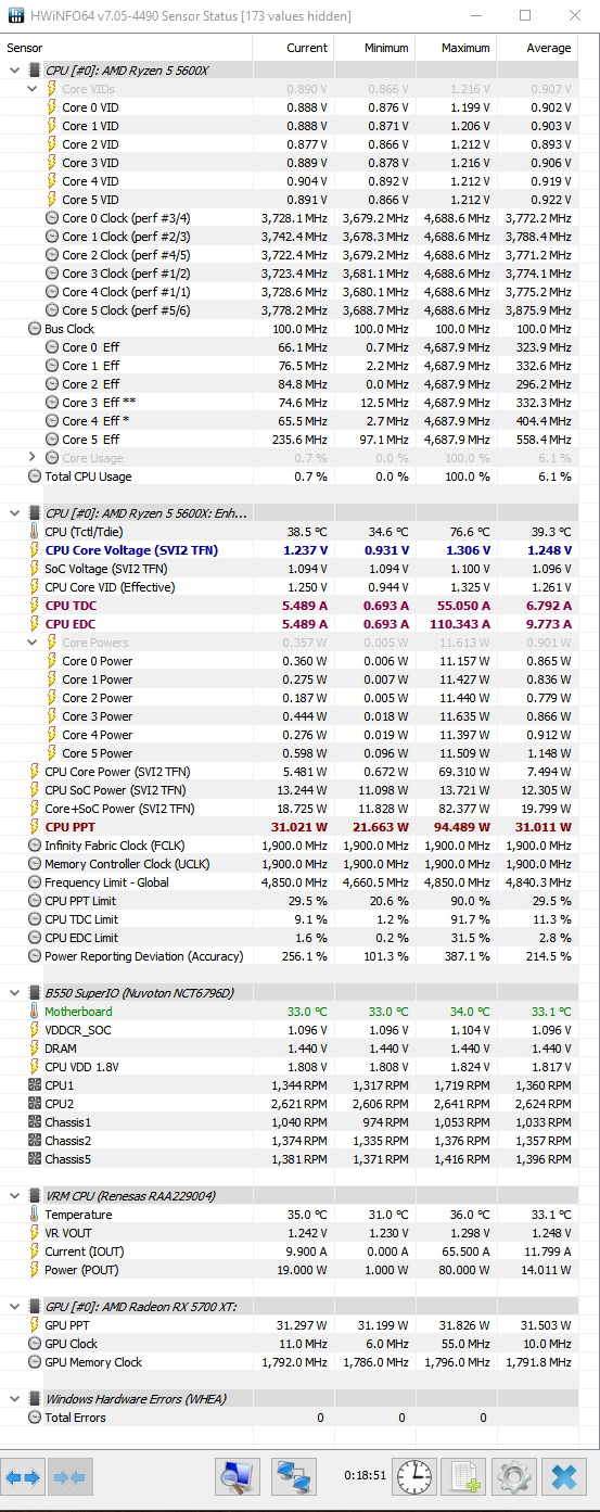 Делюсь болью и страданиями! В начале 2021 года купил я 5950X и материнку ASUS X570-I всё настроил спустя пару месяцев, радовался. Спустя пол года начались приколы, за неделю разок проскакивали ошибки WHEA Logger, по одной, потом через пару месяцев вообще критически ошибки WHEA Logger начали появляться и ребуты, причём под малыми нагрузками при просмотре видео или ютубчика, или при свёрнутой игре на паузе. После перепаковки водоблока на видюхе остались термопрокладки Gelid GP Ultimate, разобрал материнку, поменял термопрокладки на VRM, на обратной стороне VRM и на чипсете и вуаля, всё как рукой сняло. Напряжения CLDO VDDP, VDDG IOD, VDDG CCD получилось снизить до старых пределов. Какая связь между WHEA и охлаждением материнки я ХЗ. Но изначально начало помогать тупо обдув вокруг сокета 120мм вентилем. Теперь и без вентиля работает. Посмотреть бы на материнку в тепловизор.