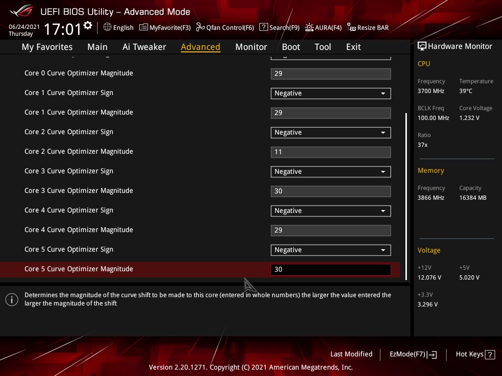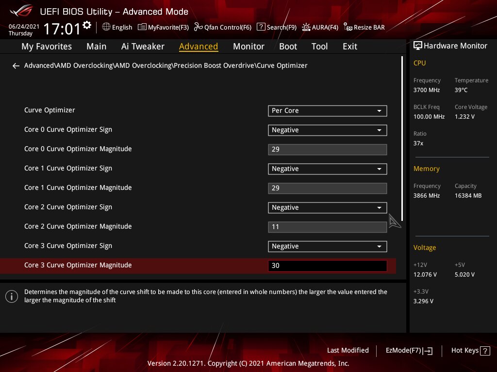 Лично я выставил сразу лимиты по максимуму что может VRM материнки и сколько может переварить охлаждение. Precision Boost Overdrive Scalar чем больше значение, тем позже и менее агрессивно процессор сбрасывает частоты после того как пропала нагрузка. Выставил на максимум. Что касается Load-Line Calibration то для всего кроме VCore выставляю в самое агрессивные значения, хотя и для VCore тоже. Precision Boost берёт во внимание показания именно мониторинга, а не запрашиваемое значение. Мониторинг материнской платы читается Precision Boost`ом через такой протокол как SVI2 TFN. Технология заключается в следующем: 1)выставляем Желаемый VCore Offset, если выставляем его в сторону увеличения, то малопоточная производительность будет выше, если в сторону уменьшения то многопоточная производительность будет выше. Под каждую настройку VCore Offset надо подправлять значения Curve Optimizer, 2)сначала для всех ядер уменьшаем Curve Optimizer, 3)запускаем скрипт, упомянутый выше, повторяем шаг номер 2, пока ни начнёт вываливаться ошибка на одном или нескольких ядрах и откатываемся на один шаг 4)запускаем после этого Cinebench R20, с большой вероятностью система просто перезагрузится, это по большей части лечится добавлением CPU PLL напряжения с 1,8V, но не превышая 1,9V, хотя от чрезмерного напряжения PLL может начаться обратный эффект и стабильность пропадёт, 5)далее начинаем настраивать Curve Optimizer для каждого ядра отдельно и проверяем стабильность как в шагах 3-4.