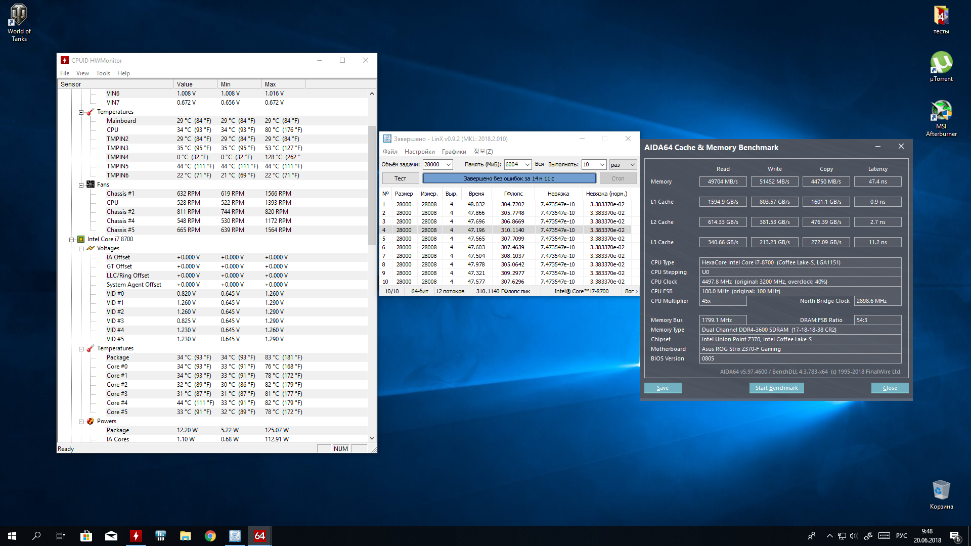 Полученный результат должен иметь следующий вид: Скриншот рабочего стола после прохождения >9 циклов (т.е. между 9 и 10 проходами). Вместе с LinX на рабочем столе должны быть развернуты CPU-Z (первая вкладка) и Core Temp, это обязательный минимум. Такой набор программ даст информацию о напряжении и температурах под нагрузкой-простоем. По желанию можете добавить другие программы, показывающие дополнительную информацию о вашей системе, например третью вкладку CPU-Z, которая покажет модель материнской платы и версию BIOS. Пример результата разгона: Mad Max, 5100 МГц (AVX 0), i7-8086K, HT-ON, Cache 4700, Vcore=1.36V, Batch L805E123, Gigabyte Z370 Aorus Gaming 7 (bios F6), Be Quiet! Dark Rock Pro 4, ЖМ под HS, Windows 10 Pro 64-bit 1809, LinX 0.9.3 64bit.