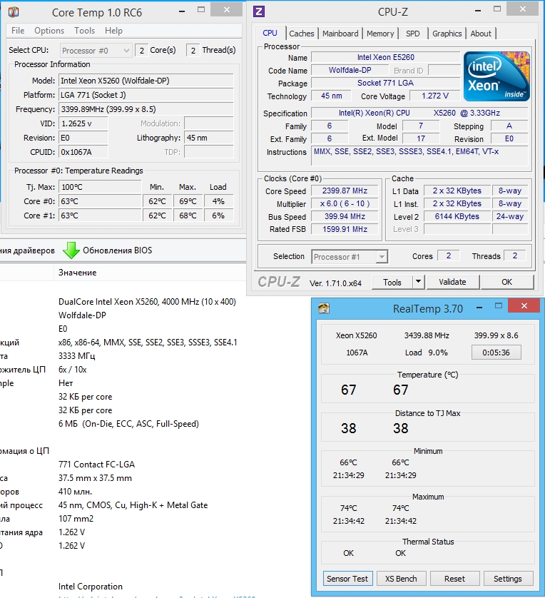 Нет вы все правильно сказали, просто у него показана температура по ядрам процессора, а в спеках интел указана температура 67 - под крышкой. http://ark.intel.com/ru/products/33083/ #77