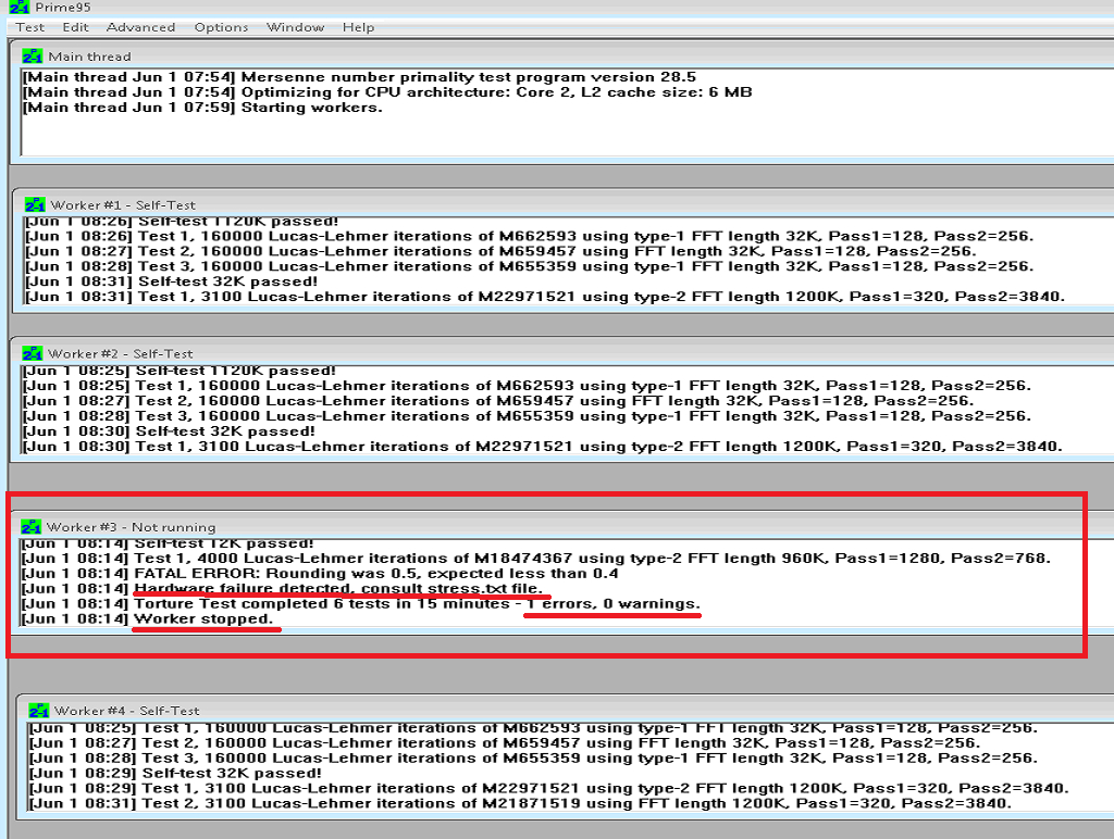 Вернул разгон на 3.61Ghz Запустил прайм95 (режим Blend)....через 15 минут 3 ядро написало ошибку,но тест не остановился....всё значки зелёные Останавливать тест пока не стал... Что это значит?Битый проц?...а именно 3 ядро проца?Вернуть продавцу?Или это результатат разгона?Вообще бывает такое что 3 ядра в стабильны а одно нет даже без разгона?.Есть ли смысл продолжать тест?