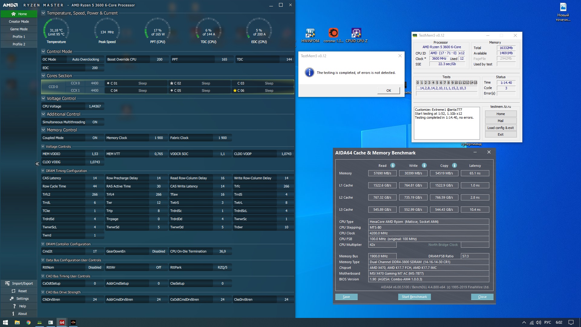 Привет всем. Попробовал память до 3800 погнать, мои дубовые гингстоны неплохо так погнались 16-16-16-16-32-fast 3800 1.4в, но это ладно. ПРоседает запись L3 кеша. Добавлял на память, vddg, vddp, проц ничего не помогает. А вот на soc ни в какую добавлять не хочет. Меньше без проблем, больше 1.1в ни как. Биос с агессой 1002 сам ставит 1.2в. Пробовал и в настройках напряжений и soc vid в разделах amd cbs и amd overclocкer. Эфекта нет, цифры те же в мониторинге. Это у меня так или вообще на агесе 1003абб? И при 3800 озу и 1900 фабрики сколько ставите vddg, vddp и vsoc? В целом работает, но просадка L3(запись, не копирование) до 520-570 GB\sec смущает, флопсы растут немного при этом, по сравнению с 3600мгц(тайминги при 3800 те же, что и при 3600). При 3600 и 1800 фабрике примерно 612\608\612 чтен\зап\копир в аиде. Куда копать?
