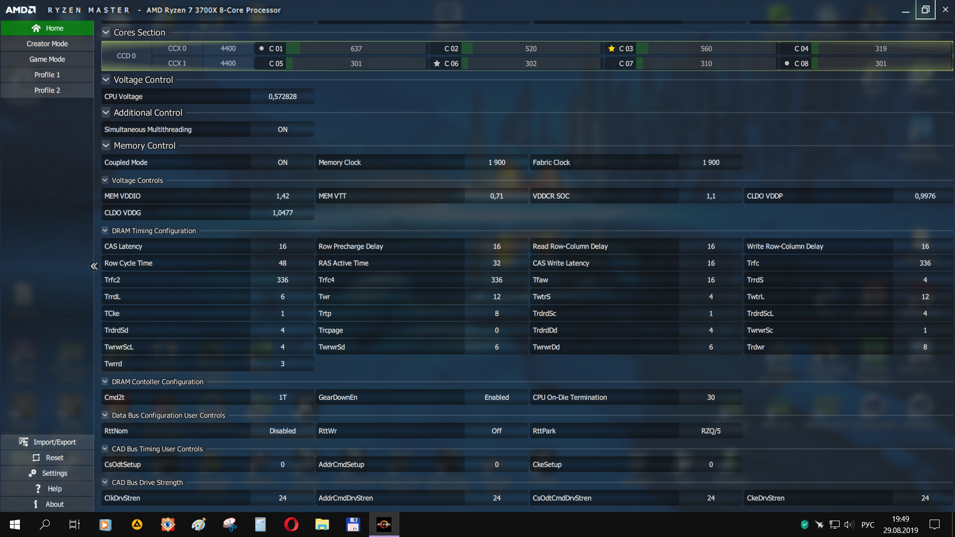 Не могли бы вы скинуть фото таймингов с райзен мастераи настройки вольтажей, имею ту же память но по кальку чет с ошибками пресеты идут.