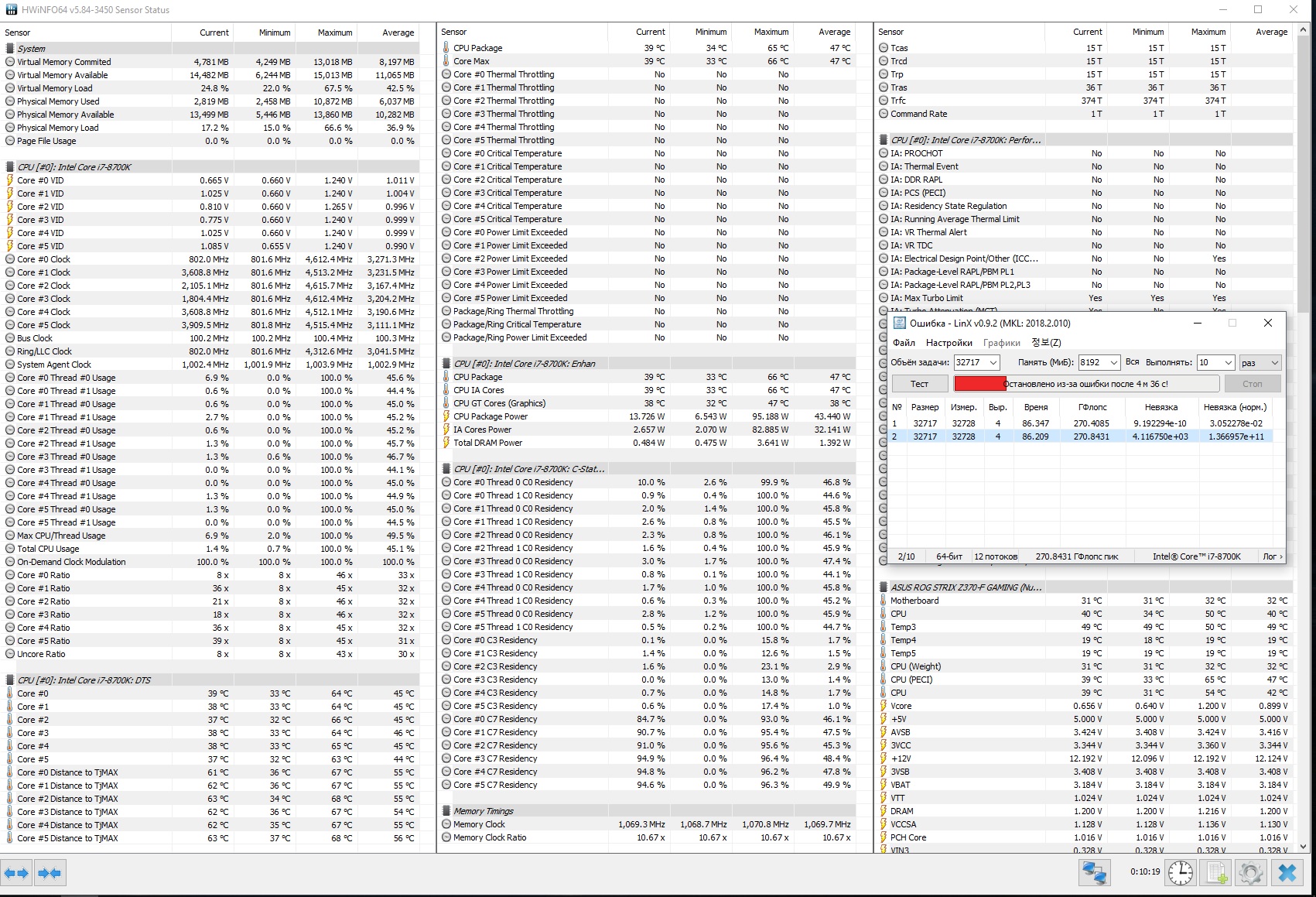 Полученный результат должен иметь следующий вид: Скриншот рабочего стола после прохождения >9 циклов (т.е. между 9 и 10 проходами). Вместе с LinX на рабочем столе должны быть развернуты CPU-Z (первая вкладка) и Core Temp, это обязательный минимум. Такой набор программ даст информацию о напряжении и температурах под нагрузкой-простоем. По желанию можете добавить другие программы, показывающие дополнительную информацию о вашей системе, например третью вкладку CPU-Z, которая покажет модель материнской платы и версию BIOS. Пример результата разгона: Mad Max, 5100 МГц (AVX 0), i7-8086K, HT-ON, Cache 4700, Vcore=1.36V, Batch L805E123, Gigabyte Z370 Aorus Gaming 7 (bios F6), Be Quiet! Dark Rock Pro 4, ЖМ под HS, Windows 10 Pro 64-bit 1809, LinX 0.9.3 64bit.