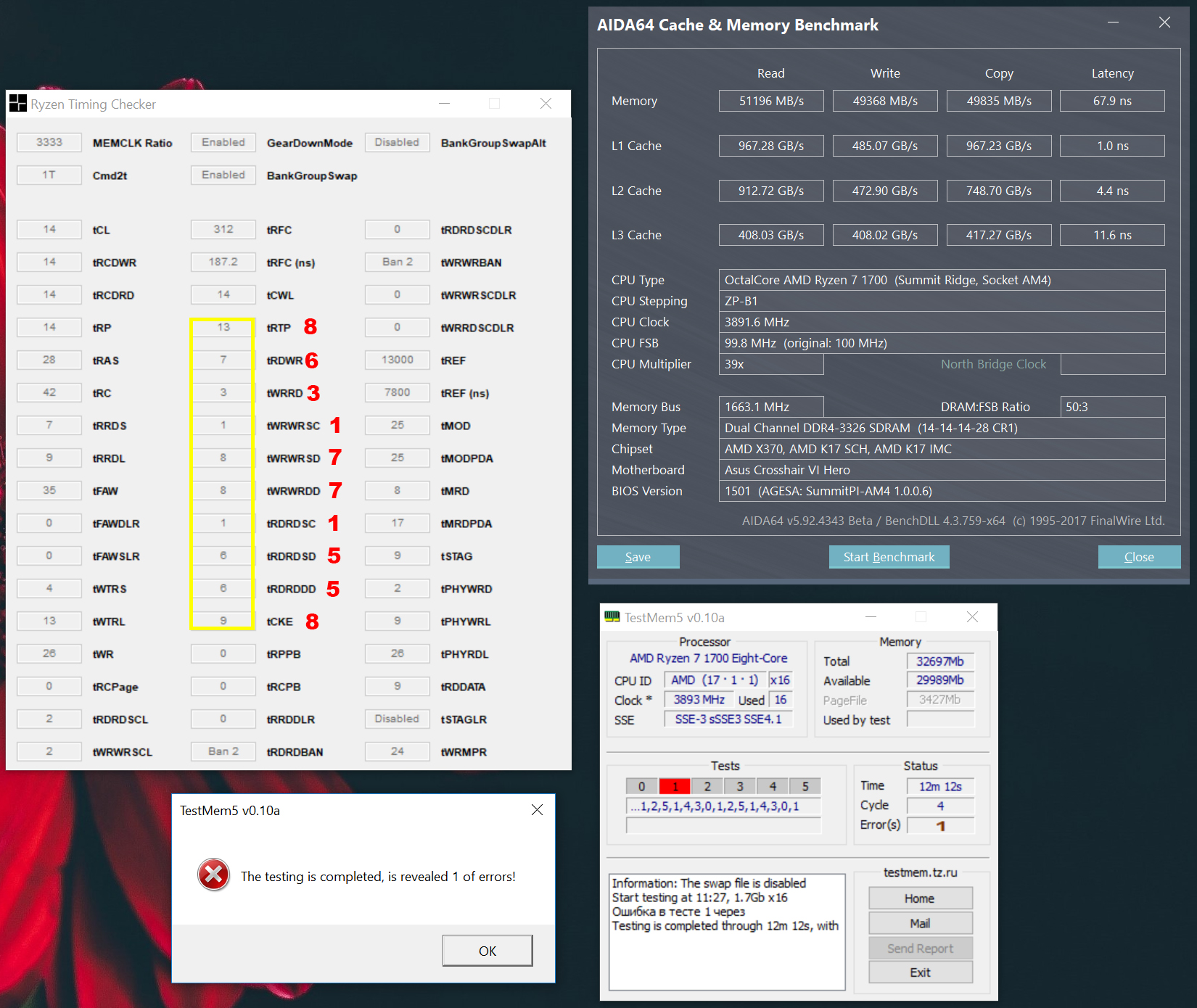 Вчера позавчера наши юзеры меня шокировали кастрированными третичными таймингами. Так вот небольшая ответочка, выкрученные тайминги в обратную сторону позволили скинуть -1 ns. И помимо этой 1 ns стабилизировал свою систему, ошибок стало на порядок меньше. Ко всем значениям желтой колонки +1 . Красным что было.