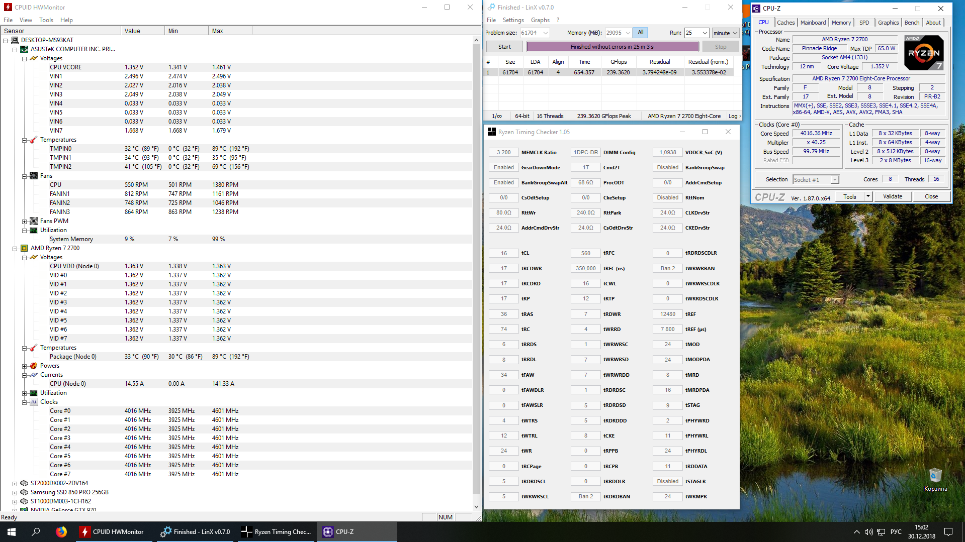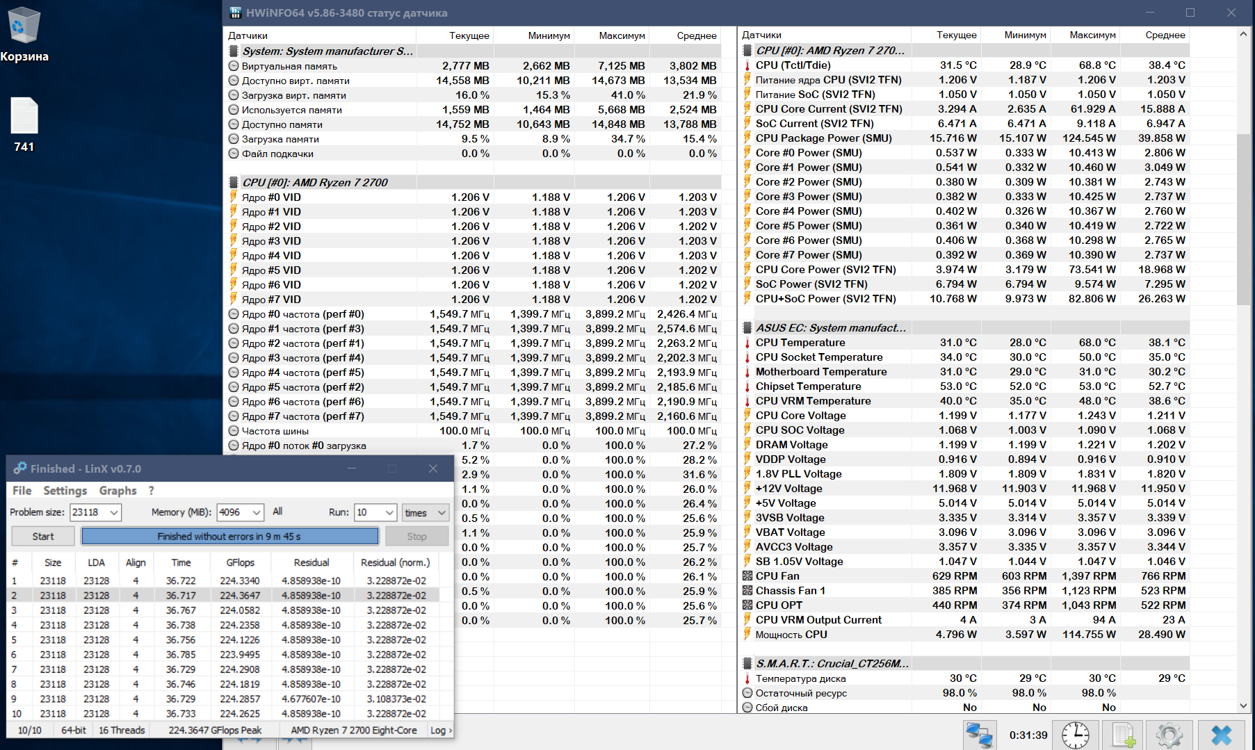 Здарова! Разогнал свой ryzen 2700, в linx отработал 25 минут без ошибок, максимальная температура была 89градусов. Кулер be quiet dark rock 4. Мать: ASUS Prime x470 Pro.