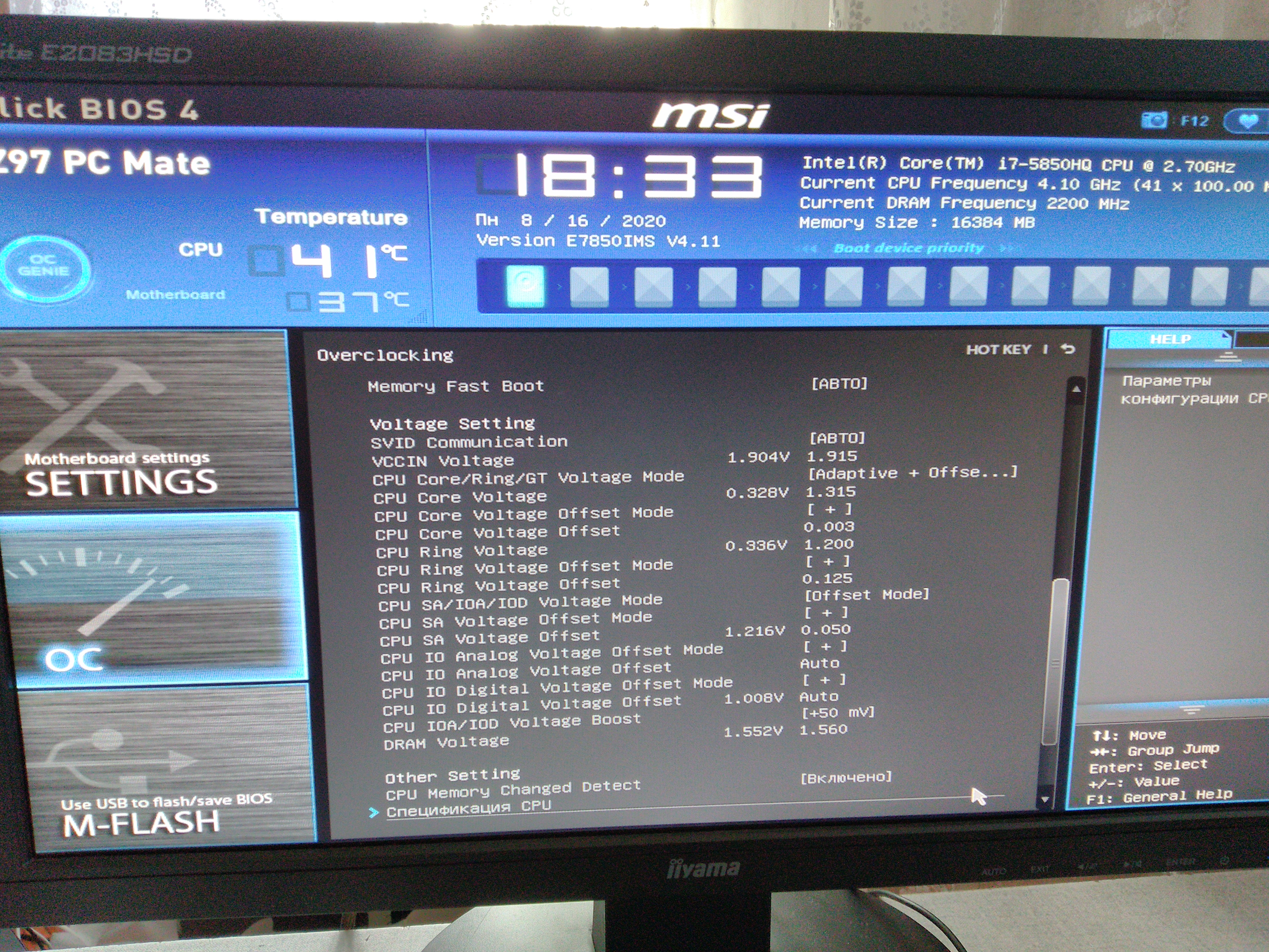 У меня такоей же конфиг. Проц brod неCrystal. 4100/3700 стабильно. Настройки в bios мутные adaptive+offset. На кольце 1.2+0.125. Ядро на ~1.32 с запасом, можно чуть меньше, даже 1.29 на ядра было достаточно при кольце 3500 с автонапругой. Vccin 1.915. Память 2200. Спрашивай, как получишь. Брал ещё в ~октябре у hugo на ebay, всё прошло чётко без наebayивания, до сих пор не жалуюсь. При неправильно подобранном напряжении могут быть ребуты и без синьки, броды очень капризные до какого-то странного баланса напруг(извращения с vcore на скринах в том числе). Имеется ввиду перебор тоже не катит. Но всё-таки это больше относится к кольцу. Выше 1.3 на ядра не рекомендуется или колечко-кольцо? Скинь пруф, много чего находил на эту тему, свои напруги тоже не с потолка брал же ж.) Регулировки частоты edram у мутантов 5xxx на нашей мамке, да и вроде на всех 97 msi, неть. У десктопного 5775с немного другие аппетиты по напряжениям, так что примеры немутированного брода к нам относятся очень косвенно, как и 5950hq. И да, мамка далеко не топ, некоторых фишек не завезли, и издеваться особо не советую.)