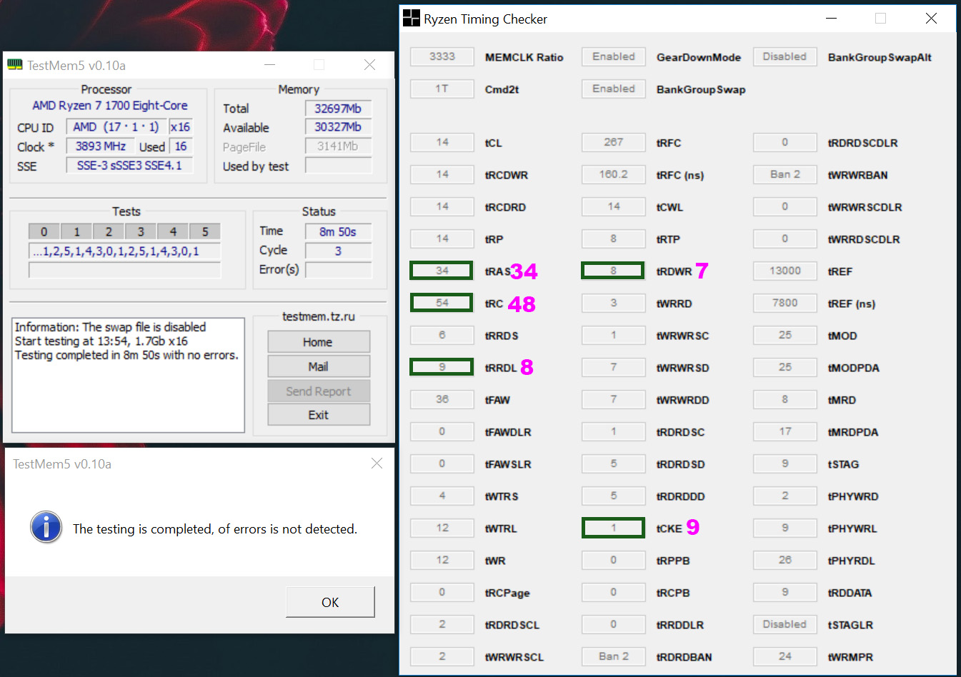 Твикнул свои вчерашние настройки 3333, и выделил тайминги, которые критически влияют на стабильность системы. Розовым пометил что у нас накаляканно в JEDEC. Грамотное послабление первичных таймингов не вызвало провала производительности + смог вчерашний результат улучшить на 2 секунды