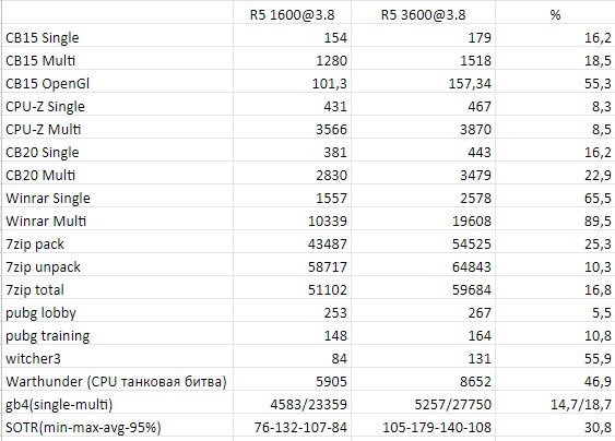 Как видно - существенный прирост в играх, порой до 50% (в пубг все уперлось в карту, даже в 720р), сюда же можно отнести тест cb15 opengl, я бы назвал это примером кривой однопоточной игры В рабочих задачах прирост не такой большой, но в среднем 15-20% наберется (за исключением пожалуй winrar, там прирост почти в 2 раза). CPU-Z измеряет попугаев в вакууме, оценивать производительность цп я бы по нему не стал... Кстати в играх 3600 на такой частоте греется кое как до 40 градусов, а вот в линкс все 70 выдает