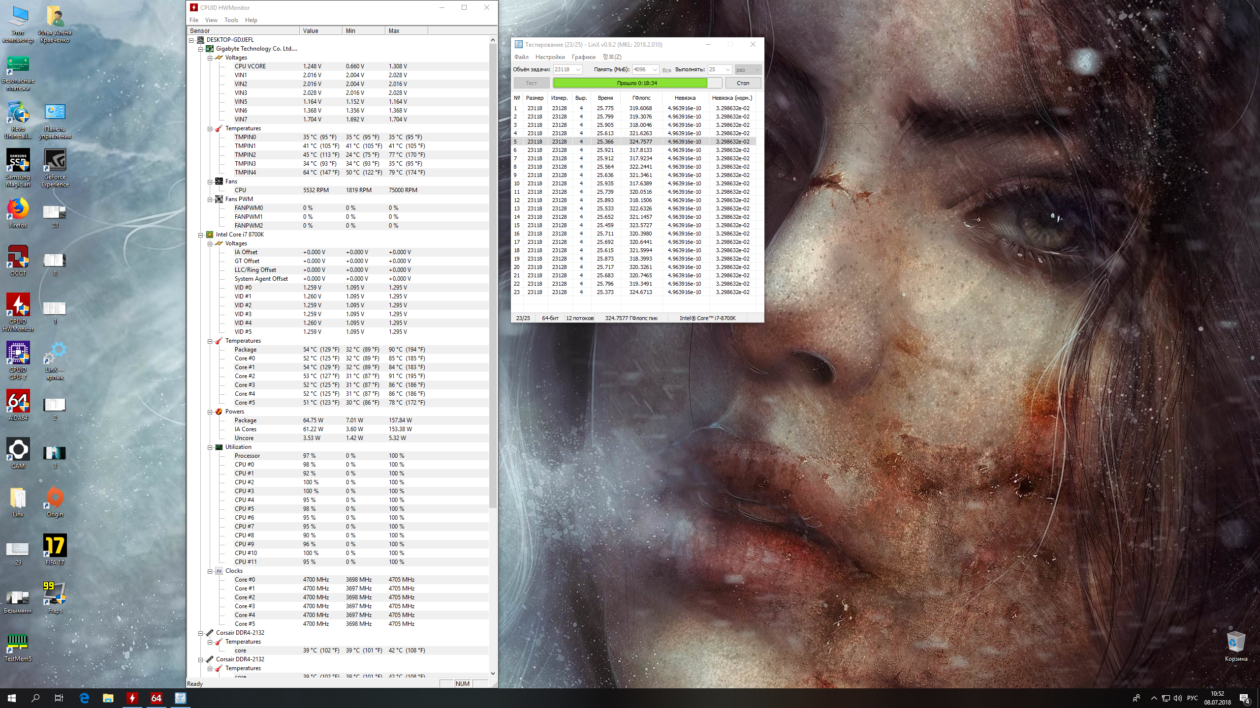Полученный результат должен иметь следующий вид: Скриншот рабочего стола после прохождения >9 циклов (т.е. между 9 и 10 проходами). Вместе с LinX на рабочем столе должны быть развернуты CPU-Z (первая вкладка) и Core Temp, это обязательный минимум. Такой набор программ даст информацию о напряжении и температурах под нагрузкой-простоем. По желанию можете добавить другие программы, показывающие дополнительную информацию о вашей системе, например третью вкладку CPU-Z, которая покажет модель материнской платы и версию BIOS. Пример результата разгона: Mad Max, 5100 МГц (AVX 0), i7-8086K, HT-ON, Cache 4700, Vcore=1.36V, Batch L805E123, Gigabyte Z370 Aorus Gaming 7 (bios F6), Be Quiet! Dark Rock Pro 4, ЖМ под HS, Windows 10 Pro 64-bit 1809, LinX 0.9.3 64bit.
