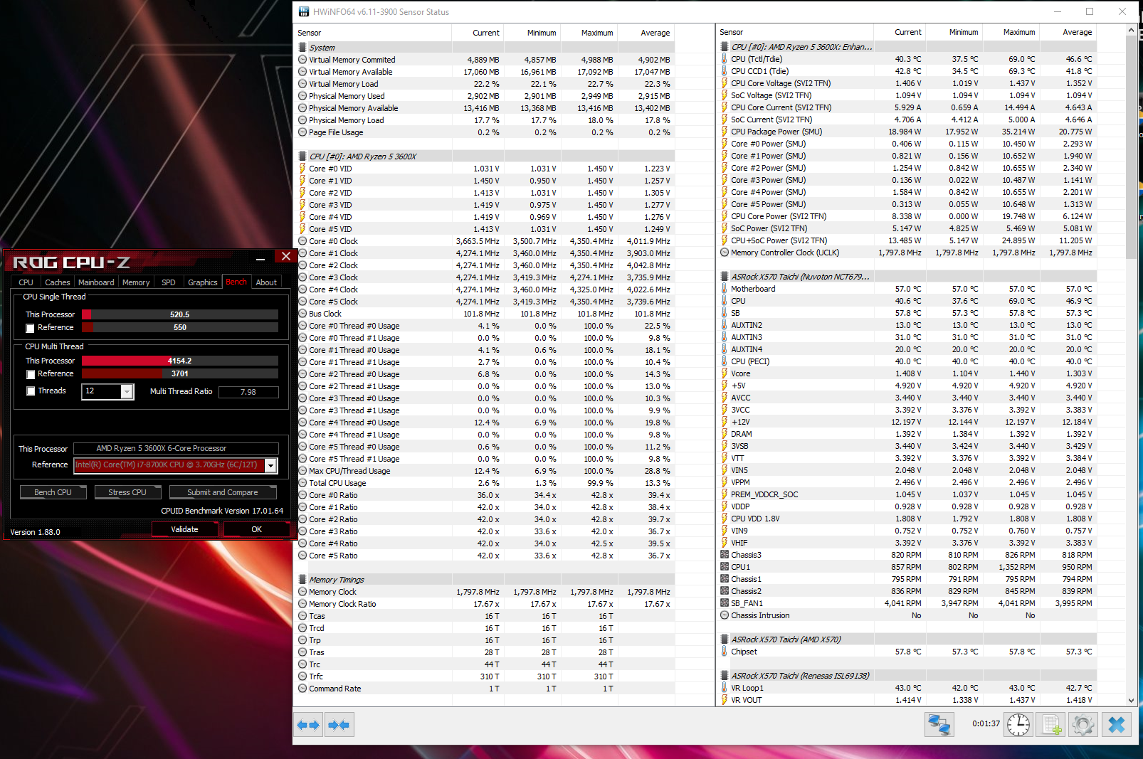 в простое падают частоты до 3.6, на одно ядро 4350(шуть шуть до заявленного буста не дотягивает). на все ядра 4150 + - 20 . ниже цпу-з