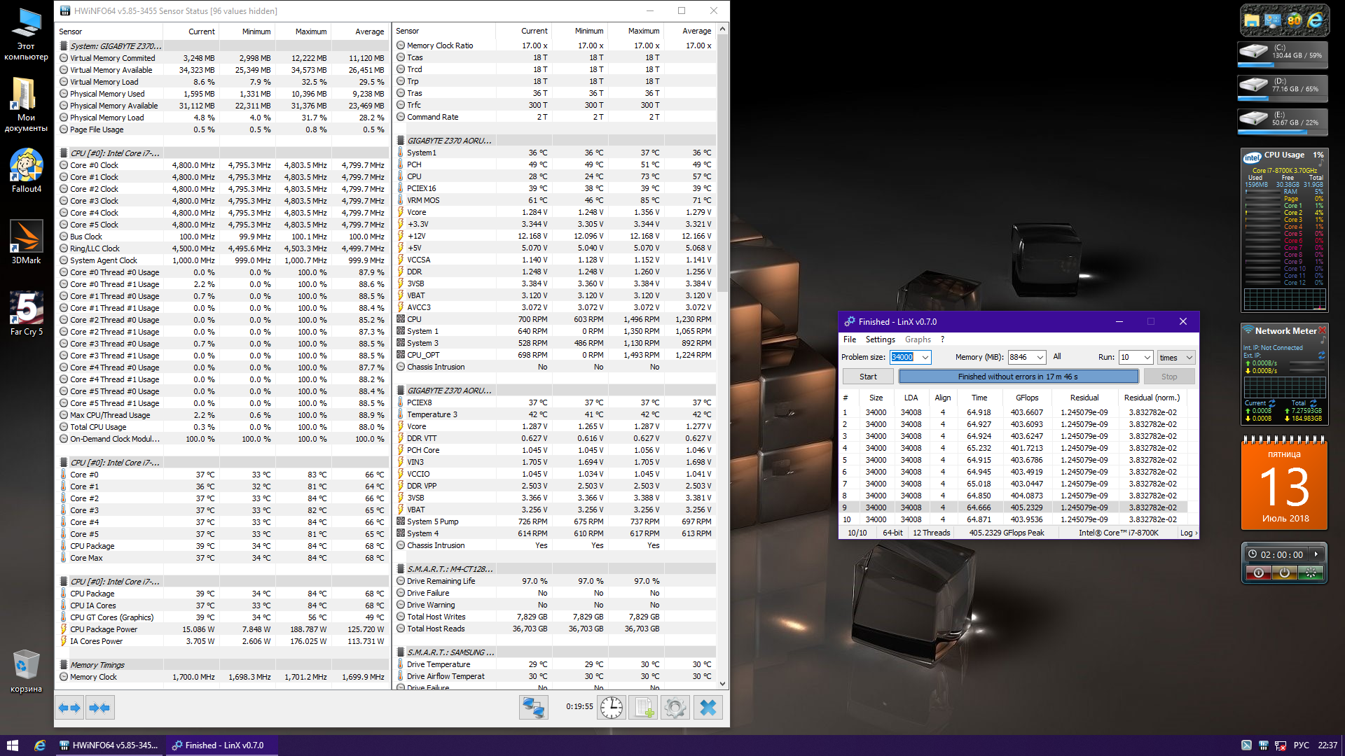 Полученный результат должен иметь следующий вид: Скриншот рабочего стола после прохождения >9 циклов (т.е. между 9 и 10 проходами). Вместе с LinX на рабочем столе должны быть развернуты CPU-Z (первая вкладка) и Core Temp, это обязательный минимум. Такой набор программ даст информацию о напряжении и температурах под нагрузкой-простоем. По желанию можете добавить другие программы, показывающие дополнительную информацию о вашей системе, например третью вкладку CPU-Z, которая покажет модель материнской платы и версию BIOS. Пример результата разгона: Mad Max, 5100 МГц (AVX 0), i7-8086K, HT-ON, Cache 4700, Vcore=1.36V, Batch L805E123, Gigabyte Z370 Aorus Gaming 7 (bios F6), Be Quiet! Dark Rock Pro 4, ЖМ под HS, Windows 10 Pro 64-bit 1809, LinX 0.9.3 64bit.