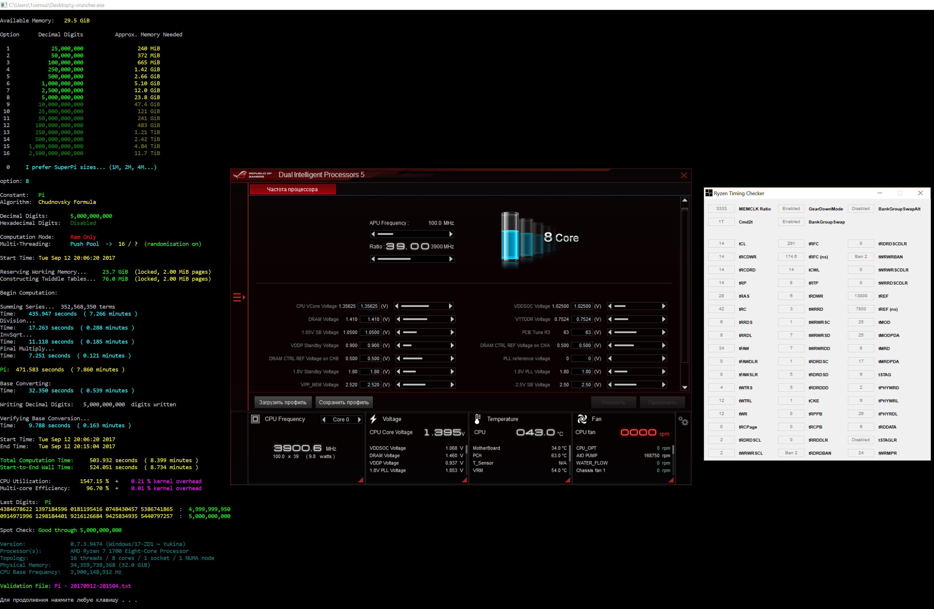[2017/09/12 19:04:53] CLDO_VDDP [auto] Ai Overclock Tuner [Manual] BCLK Frequency [100.0000] BCLK_Divider [Auto] Custom CPU Core Ratio [Auto] > CPU Core Ratio [39.00] Performance Bias [None] Memory Frequency [DDR4-3333MHz] Core Performance Boost [Disabled] SMT Mode [Auto] EPU Power Saving Mode [Disabled] TPU [Keep Current Settings] CPU Core Voltage [Manual mode] - CPU Core Voltage Override [1.36250] CPU SOC Voltage [Manual mode] - VDDSOC Voltage Override [1.02500] DRAM Voltage [1.41000] 1.8V PLL Voltage [Auto] 1.05V SB Voltage [Auto] Target TDP [Auto] Mem Over Clock Fail Count [2] DRAM CAS# Latency [16] DRAM RAS# to CAS# Read Delay [18] DRAM RAS# to CAS# Write Delay [18] DRAM RAS# PRE Time [18] DRAM RAS# ACT Time [36] Trc_SM [54] TrrdS_SM [7] TrrdL_SM [9] Tfaw_SM [35] TwtrS_SM [4] TwtrL_SM [12] Twr_SM [12] Trcpage_SM [Auto] TrdrdScl_SM [2] TwrwrScl_SM [2] Trfc_SM [291] Trfc2_SM [216] Trfc4_SM [133] Tcwl_SM [14] Trtp_SM [8] Trdwr_SM [Auto] Twrrd_SM [Auto] TwrwrSc_SM [Auto] TwrwrSd_SM [Auto] TwrwrDd_SM [Auto] TrdrdSc_SM [Auto] TrdrdSd_SM [Auto] TrdrdDd_SM [Auto] Tcke_SM [1] ProcODT_SM [68.6 ohm] Cmd2T [1T] Gear Down Mode [Auto] Power Down Enable [Auto] RttNom [RZQ/3] RttWr [RZQ/3] RttPark [RZQ/1] MemAddrCmdSetup_SM [Auto] MemCsOdtSetup_SM [Auto] MemCkeSetup_SM [Auto] MemCadBusClkDrvStren_SM [30.0 Ohm] MemCadBusAddrCmdDrvStren_SM [30.0 Ohm] MemCadBusCsOdtDrvStren_SM [40.0 Ohm] MemCadBusCkeDrvStren_SM [60.0 Ohm] VTTDDR Voltage [0.75240] VPP_MEM Voltage [2.52000] DRAM CTRL REF Voltage on CHA [Auto] DRAM CTRL REF Voltage on CHB [Auto] VDDP Voltage [0.90000] VDDP Standby Voltage [0.90000] 1.8V Standby Voltage [Auto] CPU 3.3v AUX [Auto] 2.5V SB Voltage [Auto] DRAM R1 Tune [50] DRAM R2 Tune [50] DRAM R3 Tune [50] DRAM R4 Tune [50] PCIE Tune R1 [Auto] PCIE Tune R2 [Auto] PCIE Tune R3 [Auto] PLL Tune R1 [Auto] PLL reference voltage [Auto] T Offset [Auto] Sense MI Skew [Auto] Sense MI Offset [Auto] Promontory presence [Auto] Clock Amplitude [Normal] CPU Load-line Calibration [Level 4] CPU Current Capability [130%] CPU VRM Switching Frequency [Manual] CPU Voltage Frequency [300] CPU Power Duty Control [T.Probe] CPU Power Phase Control [Optimized] CPU Power Thermal Control [120] VDDSOC Load-line Calibration [Level 3] VDDSOC Current Capability [120%] VDDSOC Switching Frequency [Manual] Fixed VDDSOC Switching Frequency(KHz) [300] VDDSOC Phase Control [Optimized] DRAM Current Capability [120%] DRAM Power Phase Control [Extreme] DRAM Switching Frequency [Manual] Fixed DRAM Switching Frequency(KHz) [300] DRAM VBoot Voltage [1.41000]