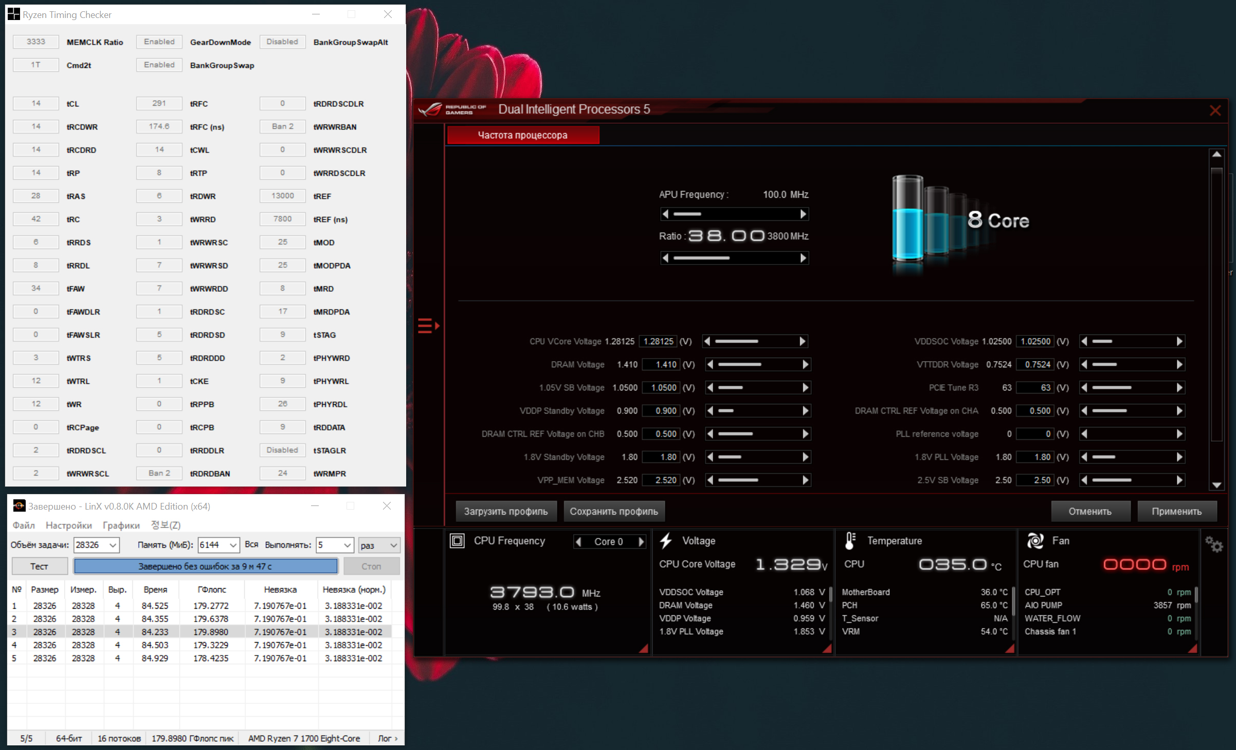 [2017/09/12 18:43:13] Ai Overclock Tuner [D.O.C.P. 1] D.O.C.P. [D.O.C.P DDR4-3200 16-18-18-36-1.35V] Частота APU [100.0000] BCLK_Divider [Авто] Custom CPU Core Ratio [Вручную] > FID [152] > DID [8] Performance Bias [Авто] Частота памяти [DDR4-3333MHz] Core Performance Boost [Авто] SMT Mode [Авто] EPU Power Saving Mode [Отключено] TPU [Keep Current Settings] Напряжение APU [Manual mode] - CPU Core Voltage Override [1.35000] CPU SOC Voltage [Manual mode] - VDDSOC Voltage Override [1.07500] Напряжение DRAM [1.44000] 1.8V PLL Voltage [1.80000] 1.05V SB Voltage [1.10000] Target TDP [Auto] TRC_EOM [Auto] TRTP_EOM [Auto] TRRS_S_EOM [Auto] TRRS_L_EOM [Auto] TWTR_EOM [Auto] TWTR_L_EOM [Auto] TWCL_EOM [Auto] TWR_EOM [Auto] TFAW_EOM [Auto] TRCT_EOM [Auto] TREFI_EOM [Auto] TRDRD_DD_EOM [Auto] TRDRD_SD_EOM [Auto] TRDRD_SC_EOM [Auto] TRDRD_SCDLR_EOM [Auto] TRDRD_SCL_EOM [Auto] TWRWR_DD_EOM [Auto] TWRWR_SD_EOM [Auto] TWRWR_SC_EOM [Auto] TWRWR_SCDLR_EOM [Auto] TWRWR_SCL_EOM [Auto] TWRRD_EOM [Auto] TRDWR_EOM [Auto] TWRRD_SCDLR_EOM [Auto] Mem Over Clock Fail Count [Auto] DRAM CAS# Latency [18] DRAM RAS# to CAS# Read Delay [20] DRAM RAS# to CAS# Write Delay [20] DRAM RAS# PRE Time [20] DRAM RAS# ACT Time [40] Trc_SM [Auto] TrrdS_SM [Auto] TrrdL_SM [Auto] Tfaw_SM [Auto] TwtrS_SM [Auto] TwtrL_SM [Auto] Twr_SM [Auto] Trcpage_SM [Auto] TrdrdScl_SM [Auto] TwrwrScl_SM [Auto] Trfc_SM [Auto] Trfc2_SM [Auto] Trfc4_SM [Auto] Tcwl_SM [Auto] Trtp_SM [Auto] Trdwr_SM [Auto] Twrrd_SM [Auto] TwrwrSc_SM [Auto] TwrwrSd_SM [Auto] TwrwrDd_SM [Auto] TrdrdSc_SM [Auto] TrdrdSd_SM [Auto] TrdrdDd_SM [Auto] Tcke_SM [Auto] ProcODT_SM [68.6 ohm] Cmd2T [1T] Gear Down Mode [Авто] Power Down Enable [Авто] RttNom [Rtt_Nom Disable] RttWr [RZQ/3] RttPark [RZQ/1] MemAddrCmdSetup_SM [Auto] MemCsOdtSetup_SM [Auto] MemCkeSetup_SM [Auto] MemCadBusClkDrvStren_SM [20.0 Ohm] MemCadBusAddrCmdDrvStren_SM [20.0 Ohm] MemCadBusCsOdtDrvStren_SM [40.0 Ohm] MemCadBusCkeDrvStren_SM [60.0 Ohm] VTTDDR Voltage [Auto] VPP_MEM Voltage [2.52000] DRAM CTRL REF Voltage on CHA [Auto] DRAM CTRL REF Voltage on CHB [Auto] VDDP Voltage [Auto] VDDP Standby Voltage [Auto] 1.8V Standby Voltage [Auto] CPU 3.3v AUX [Auto] 2.5V SB Voltage [Auto] DRAM R1 Tune [Auto] DRAM R2 Tune [Auto] DRAM R3 Tune [Auto] DRAM R4 Tune [Auto] PCIE Tune R1 [Авто] PCIE Tune R2 [Авто] PCIE Tune R3 [Auto] PLL Tune R1 [Авто] PLL reference voltage [Auto] T Offset [Auto] Sense MI Skew [Авто] Sense MI Offset [Auto] Promontory presence [Авто] Clock Amplitude [Авто] CPU Load-Line Calibration [Level 3] Ток процессора [130%] CPU VRM Switching Frequency [Авто] VRM Spread Spectrum [Disabled] Active Frequency Mode [Disabled] CPU Power Duty Control [T.Probe] Управление фазой питания процессора [Power Phase Response] Ручная регулировка [Регулярный] CPU Power Thermal Control [120] VDDSOC Load-line Calibration [Level 3] VDDSOC Current Capability [120%] VDDSOC Switching Frequency [Авто] VDDSOC Phase Control [Оптимизировано] DRAM Current Capability [120%] DRAM Power Phase Control [Extreme] DRAM Switching Frequency [Вручную] Fixed DRAM Switching Frequency(KHz) [300] DRAM VBoot Voltage [1.44000] Security Device Support [Enable] TPM Device Selection [Discrete TPM] Erase fTPM NV for factory reset [Enabled] PSS Support [Enabled] NX Mode [Enabled] SVM Mode [Отключено] SATA Port Enable [Включено] PT XHCI GEN1 [Авто] PT XHCI GEN2 [Авто] PT USB Equalization4 [Авто] PT USB Redriver [Авто] PT PCIE PORT 0 [Авто] PT PCIE PORT 1 [Авто] PT PCIE PORT 2 [Авто] PT PCIE PORT 3 [Авто] PT PCIE PORT 4 [Авто] PT PCIE PORT 5 [Авто] PT PCIE PORT 6 [Авто] PT PCIE PORT 7 [Авто] Onboard PCIE LAN PXE ROM [Включено] AMD CRB EHCI Debug port switch [Отключено] Onboard LED [Включено] Hyper kit Mode [Отключено] SATA Port Enable [Включено] SATA Mode [AHCI] Проверка состояния S.M.A.R.T [Enabled] Hot Plug [Отключено] Hot Plug [Отключено] Hot Plug [Отключено] Hot Plug [Отключено] Hot Plug [Отключено] Hot Plug [Отключено] Hot Plug [Отключено] Hot Plug [Отключено] Соответствие ErP [Отключено] Restore On AC Power Loss [Power Off] Включение посредством PCI-E/PCI [Отключено] Включение посредством RTC [Отключено] Super I/O Clock Skew [Авто] Контроллер звука высокой четкости [Включено] PCIEX4_3 Bandwidth [Авто] PCIEX16_1 Mode [Авто] PCIEX8_2 Mode [Авто] PCIEX4_3 Mode [Авто] M.2 Link Mode [Авто] SB Link Mode [Авто] Контроллер Asmedia USB 3.1 [Включено] RGB LED lighting [Включено] In sleep, hibernate and soft off states [Вкл] Realtek LAN Controller [Enabled] Intel LAN OPROM [Disabled] USB Type C Power Switch for USB3.1_E1 [Авто] USB Type C Power Switch for USB3.1_EC2 [Авто] Сетевой стек [Отключено] Debug Port Table [Disabled] Debug Port Table 2 [Disabled] Устройство [SanDisk SDSSDA120G] Legacy USB Support [Enabled] XHCI Hand-off [Enabled] USB Mass Storage Driver Support [Enabled] KingstonDataTraveler 2.01.00 [Auto] USB3.1_E1 [Авто] USB3_1 [Включено] USB3_2 [Включено] USB3_3 [Включено] USB3_4 [Включено] USB3_5 [Авто] USB3_6 [Авто] USB3_7 [Авто] USB3_8 [Авто] USB3_9 [Авто] USB3_10 [Авто] USB2_11 [Авто] USB2_12 [Авто] USB2_13 [Авто] USB2_14 [Авто] USB_15 [Авто] USB_16 [Авто] Температура процессора [Monitor] Температура материнской платы [Monitor] VRM Temperature [Monitor] PCH Temperature [Monitor] T_Sensor1 Temperature [Monitor] С