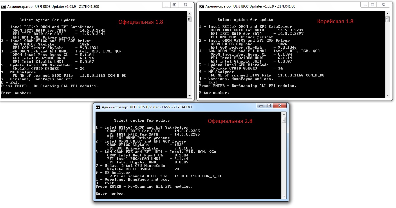 w3er, интересное кино.. Смотрите, если для примера рассмотреть мат. плату Asrock Z170 Extreme4. У корейцев версия биоса подписана как Z17EX4_1.80_M_ES-HWTIPS_v3.zip, из чего можно сделать вывод, что она базируется на версии 1.80 (что кстати только предположение). С другой стороны, почему именно 1.80? Почему не более новые? Последний официальный биос со страницы http://www.asrock.com/mb/Intel/Z170%20Extreme4/index.ru.asp?cat=Download&os=BIOS, где не убрана функция разгона скайлейков, имеет версию 2.80. Почему корейцы остановились на 1.80?