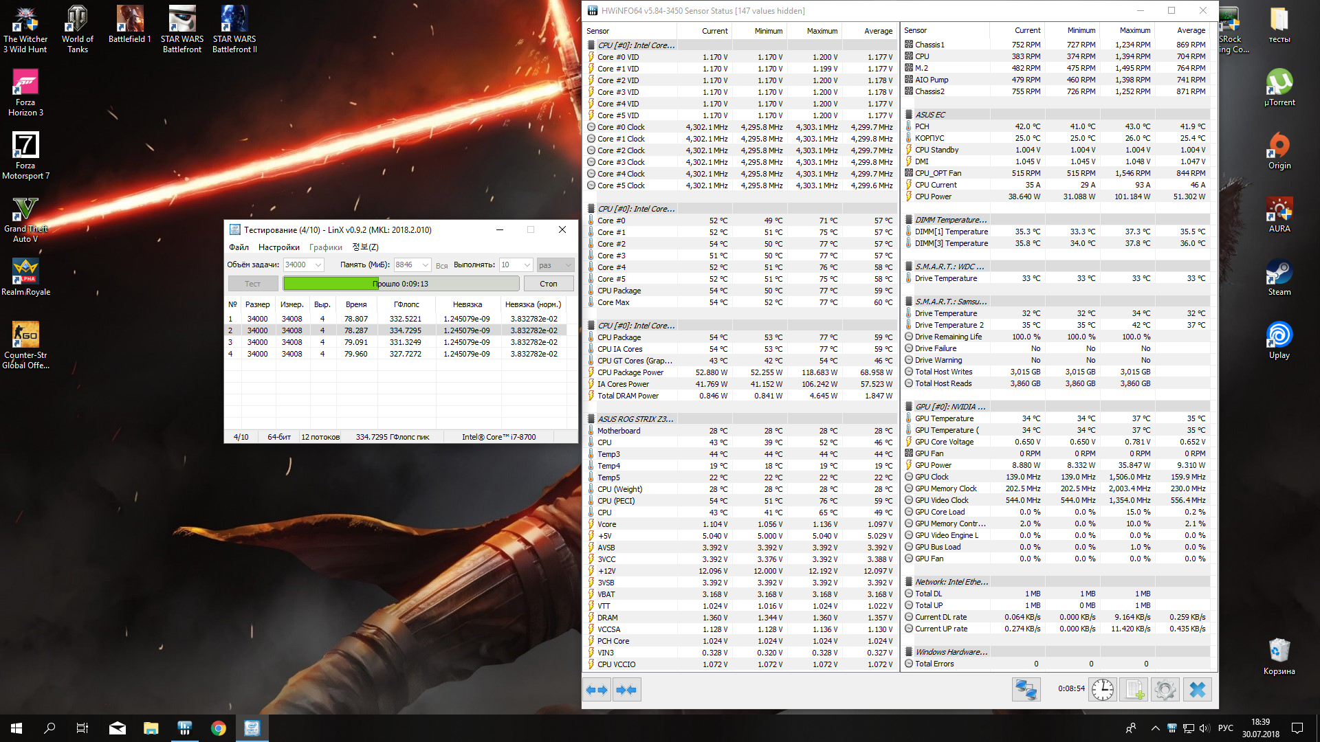 Полученный результат должен иметь следующий вид: Скриншот рабочего стола после прохождения >9 циклов (т.е. между 9 и 10 проходами). Вместе с LinX на рабочем столе должны быть развернуты CPU-Z (первая вкладка) и Core Temp, это обязательный минимум. Такой набор программ даст информацию о напряжении и температурах под нагрузкой-простоем. По желанию можете добавить другие программы, показывающие дополнительную информацию о вашей системе, например третью вкладку CPU-Z, которая покажет модель материнской платы и версию BIOS. Пример результата разгона: Mad Max, 5100 МГц (AVX 0), i7-8086K, HT-ON, Cache 4700, Vcore=1.36V, Batch L805E123, Gigabyte Z370 Aorus Gaming 7 (bios F6), Be Quiet! Dark Rock Pro 4, ЖМ под HS, Windows 10 Pro 64-bit 1809, LinX 0.9.3 64bit.