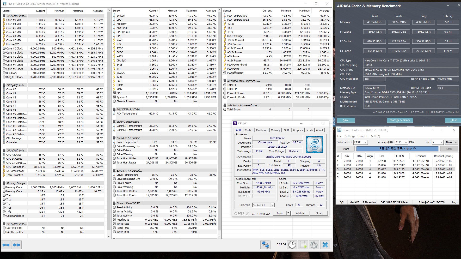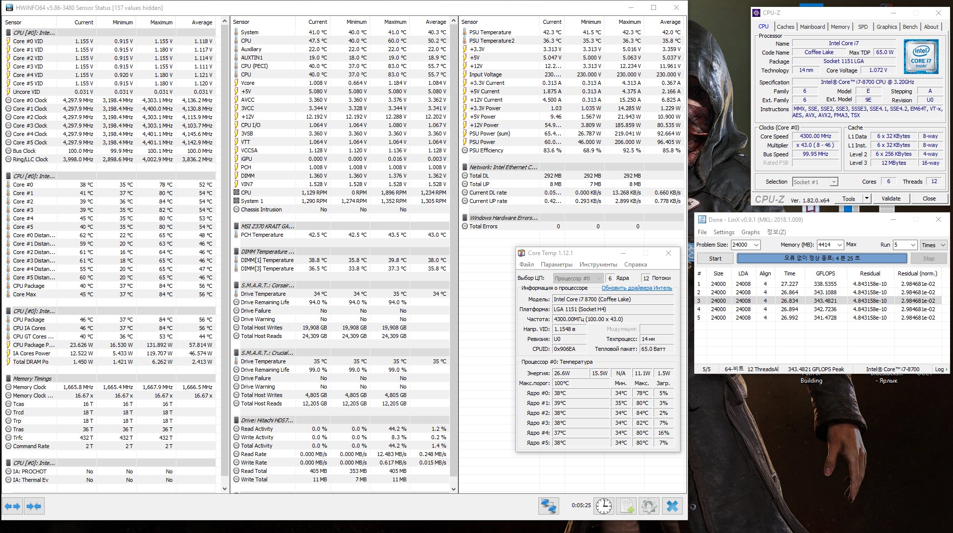 Полученный результат должен иметь следующий вид: Скриншот рабочего стола после прохождения >9 циклов (т.е. между 9 и 10 проходами). Вместе с LinX на рабочем столе должны быть развернуты CPU-Z (первая вкладка) и Core Temp, это обязательный минимум. Такой набор программ даст информацию о напряжении и температурах под нагрузкой-простоем. По желанию можете добавить другие программы, показывающие дополнительную информацию о вашей системе, например третью вкладку CPU-Z, которая покажет модель материнской платы и версию BIOS. Пример результата разгона: Mad Max, 5100 МГц (AVX 0), i7-8086K, HT-ON, Cache 4700, Vcore=1.36V, Batch L805E123, Gigabyte Z370 Aorus Gaming 7 (bios F6), Be Quiet! Dark Rock Pro 4, ЖМ под HS, Windows 10 Pro 64-bit 1809, LinX 0.9.3 64bit.
